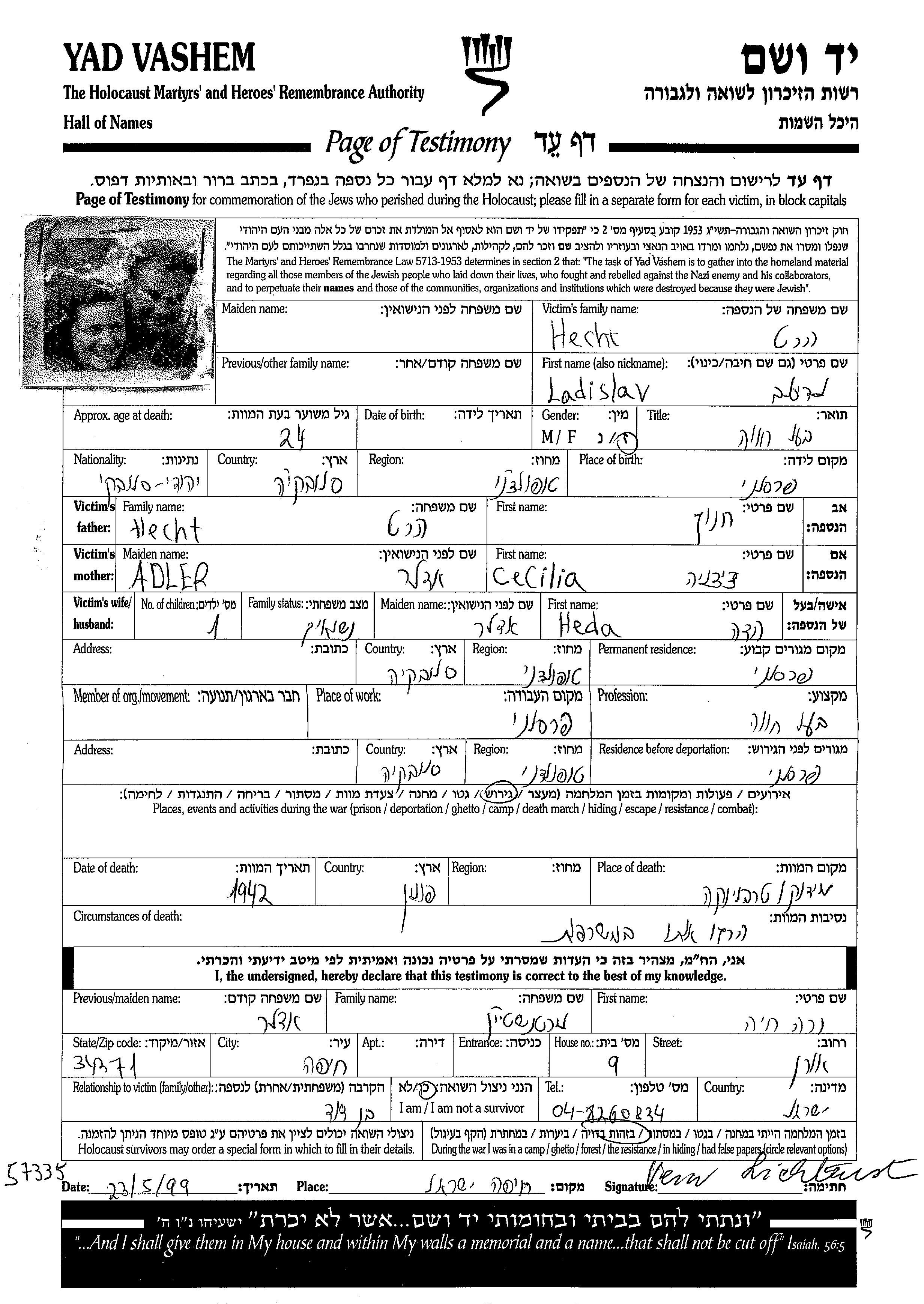 Ladislav Hecht wurde im Jahr 1918 in Preselany, Tschechoslowakei geboren. Er war Großbauer/-bäuerin. Vor dem Zweiten Weltkrieg lebte er in Preselany, Tschechoslowakei.