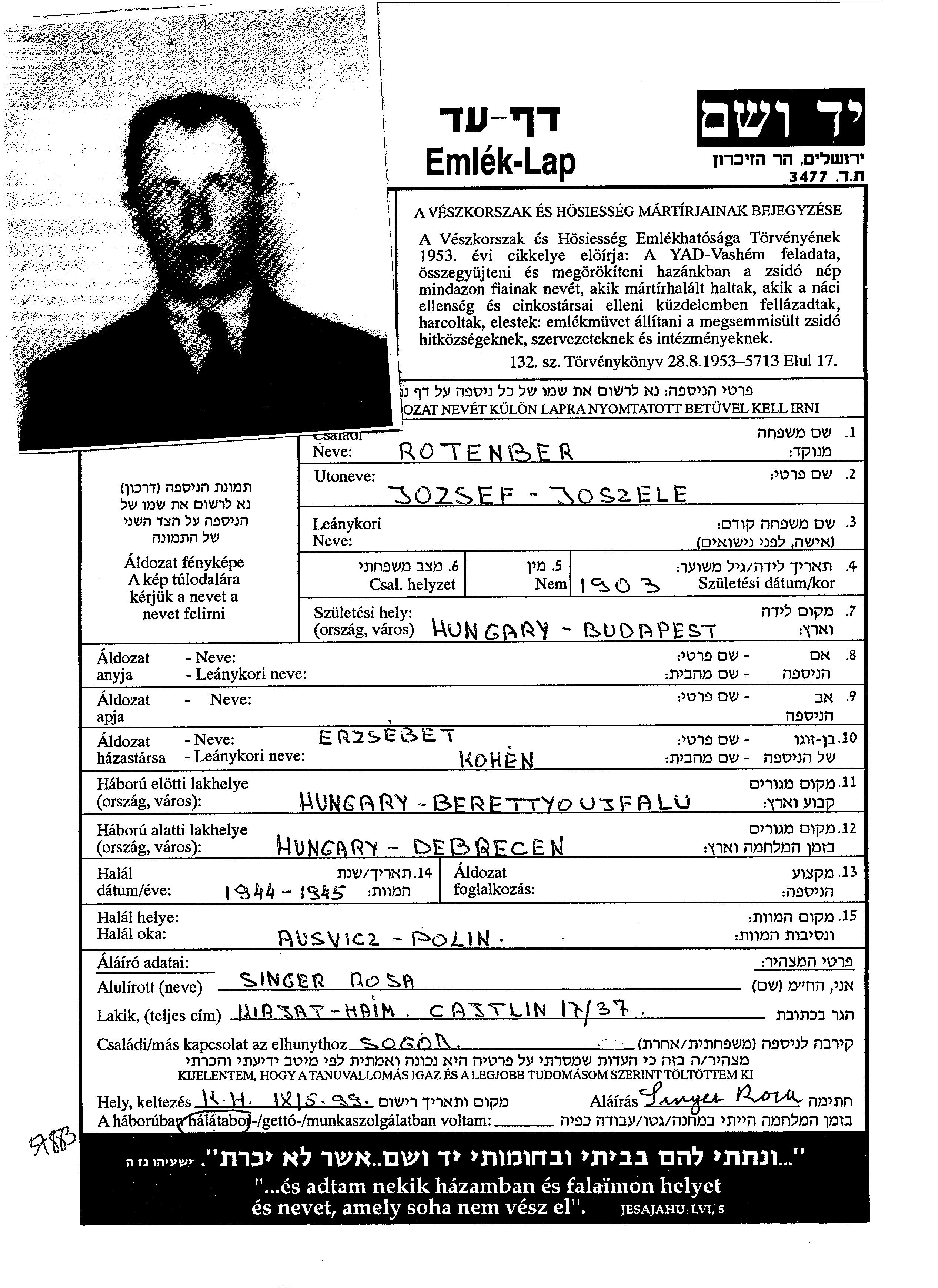 Joszele Rotenber wurde im Jahr 1903 in Budapest, Ungarn geboren. Vor dem Zweiten Weltkrieg lebte er in Told, Ungarn.