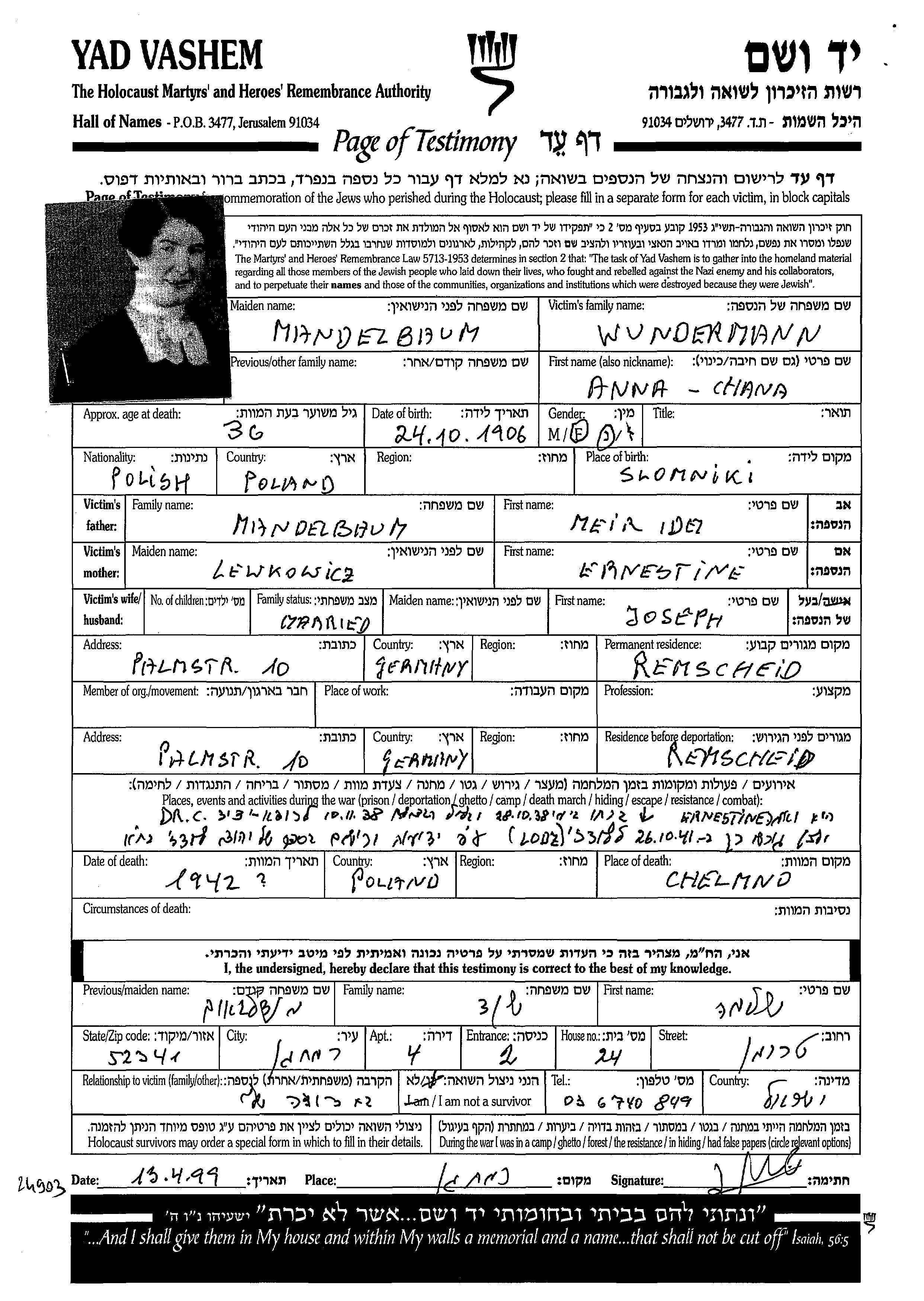 Chana Anna wurde in der Schoah ermordet. Todesort: Chelmno, Polen im Jahr 1942.
