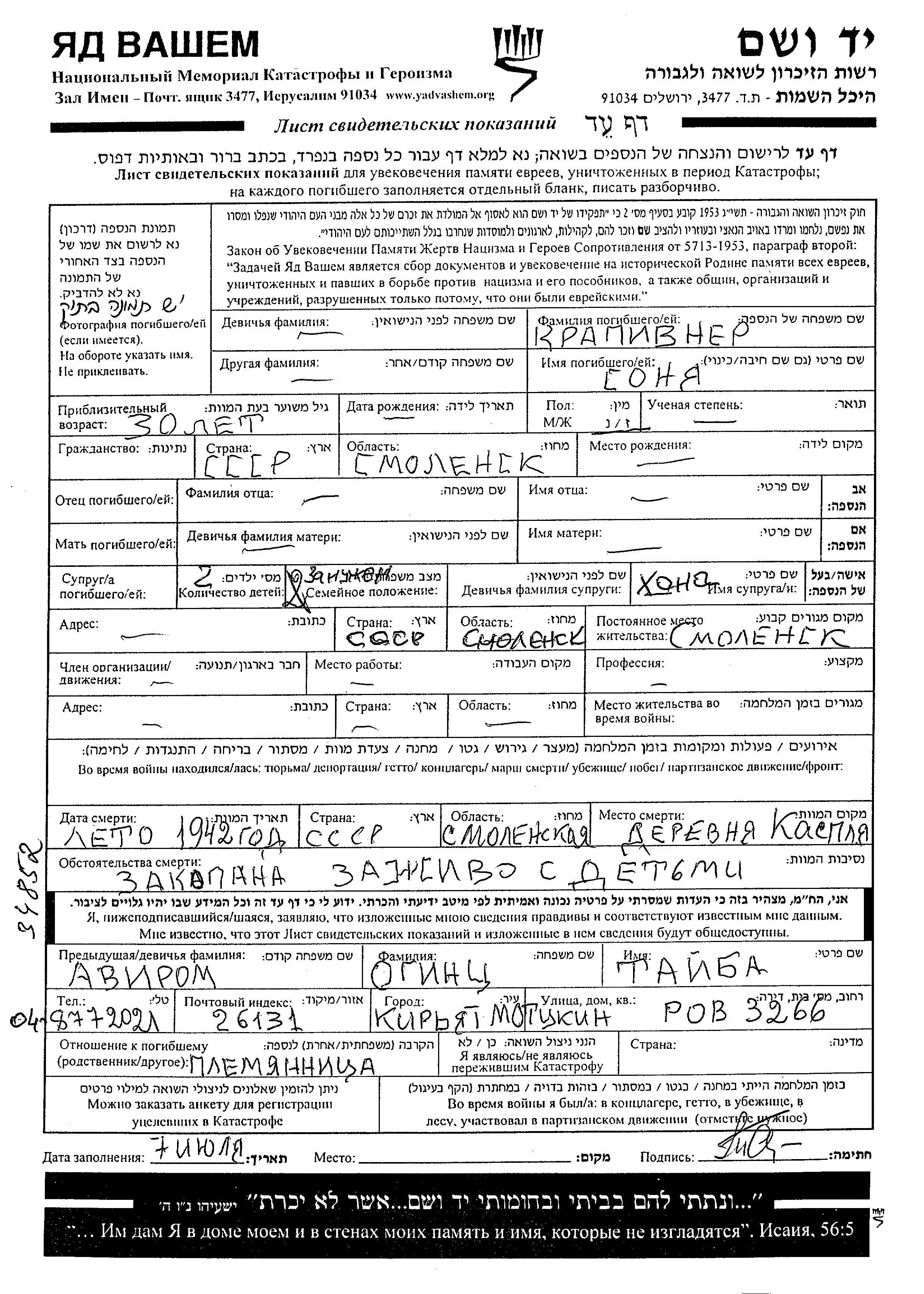 Sonya Krapivner wurde im Jahr 1912 in Smolensk, Russland (UdSSR) geboren. Vor dem Zweiten Weltkrieg lebte sie in Smolensk, Russland (UdSSR).