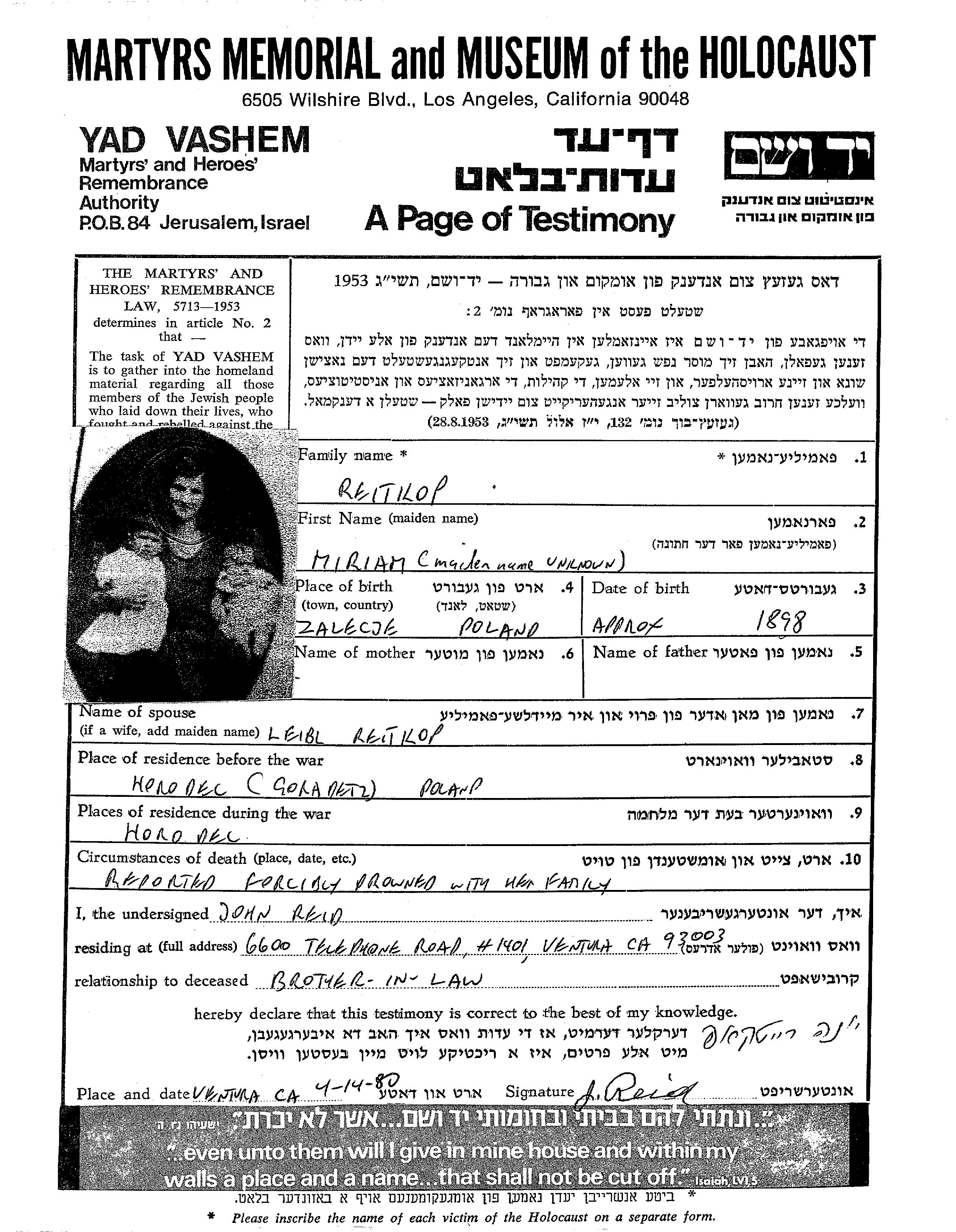 Miriam Reitkop wurde im Jahr 1898 in Zalesie, Poland geboren. Vor dem Zweiten Weltkrieg lebte sie in Horodec, Polen.