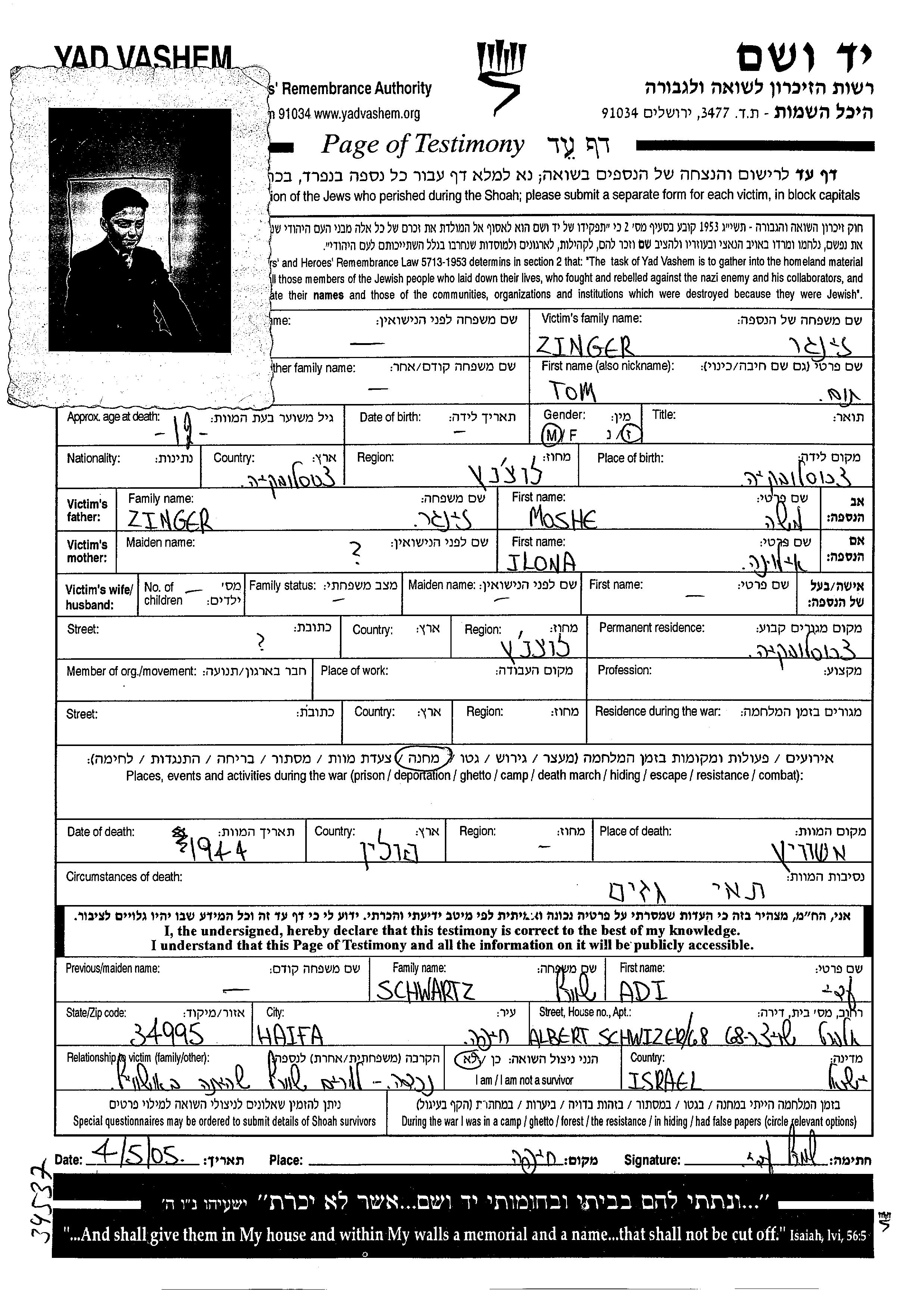 Tomas Zinger wurde im Jahr 1932 in Lucenec, Tschechoslowakei geboren. Vor dem Zweiten Weltkrieg lebte er in Lucenec, Tschechoslowakei.