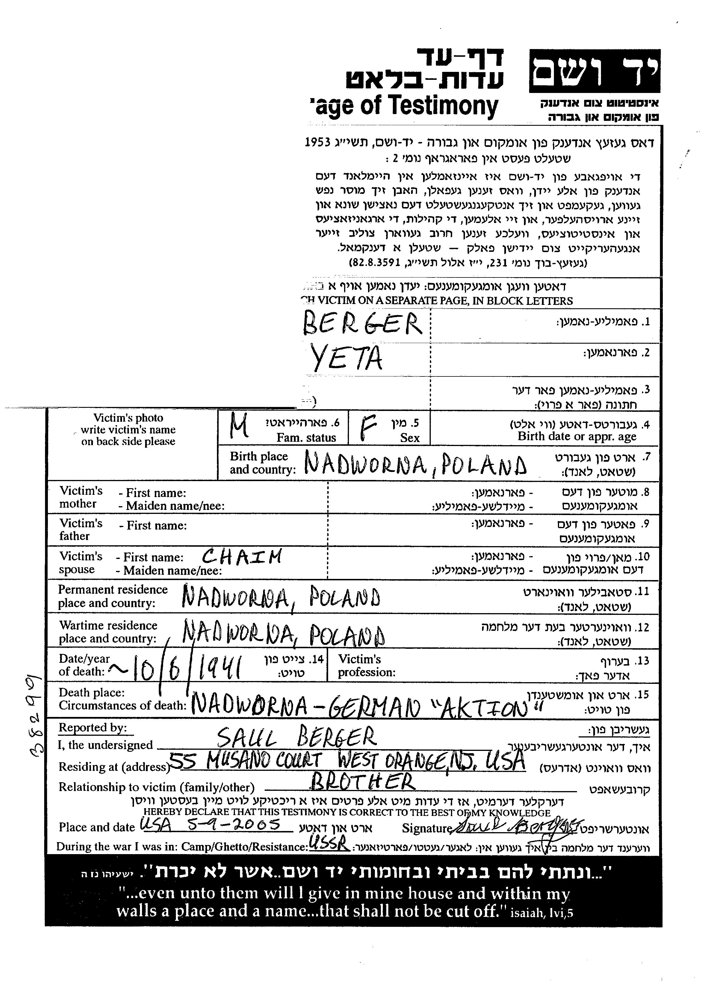 Yeta Berger wurde in Nadworna, Polen geboren. Vor dem Zweiten Weltkrieg lebte sie in Nadworna, Polen.