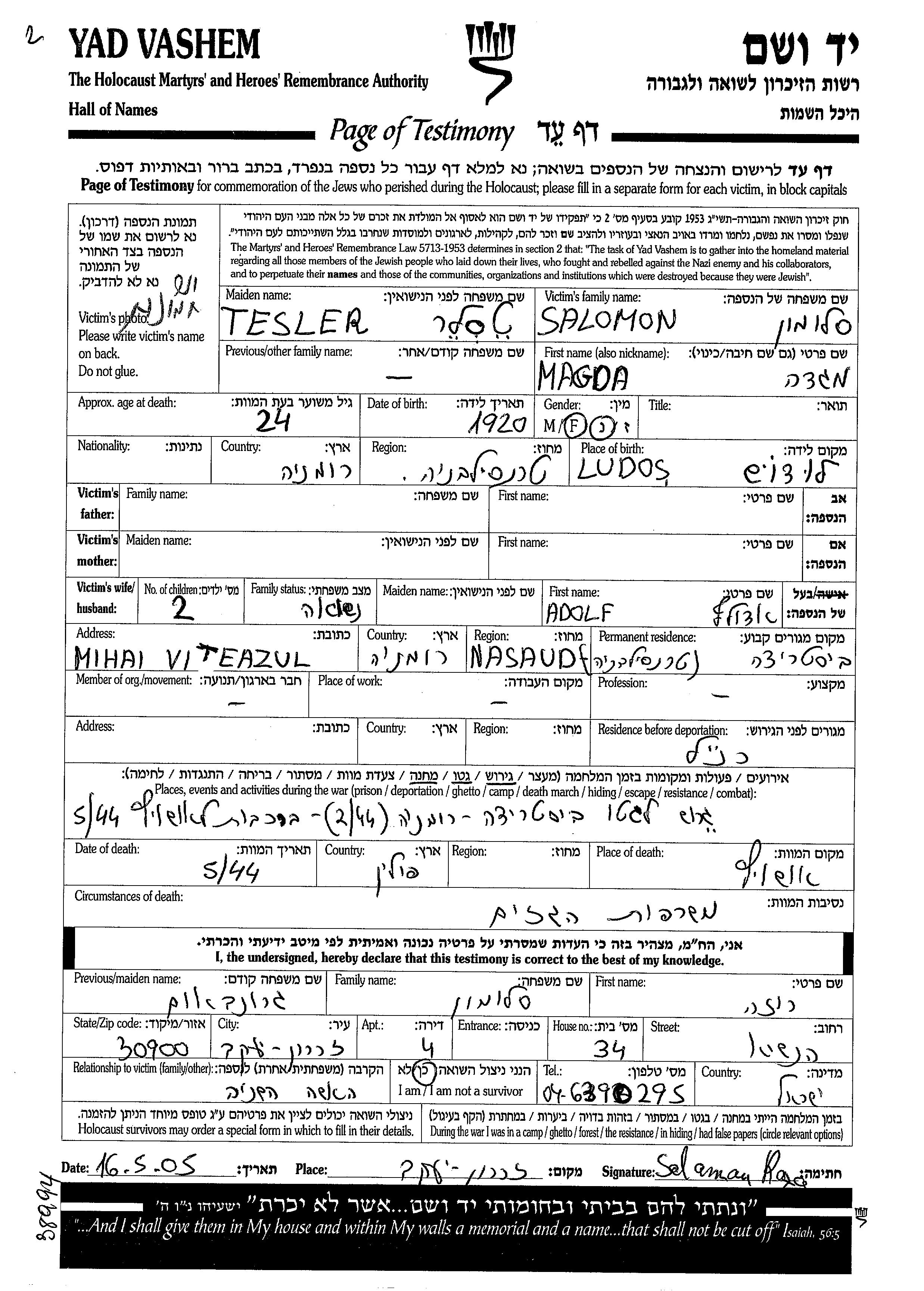 Magda Salomon, geb. Tesler wurde im Jahr 1920 in Ludus, Rumänien geboren. Vor dem Zweiten Weltkrieg lebte sie in Bistrita, Rumänien.