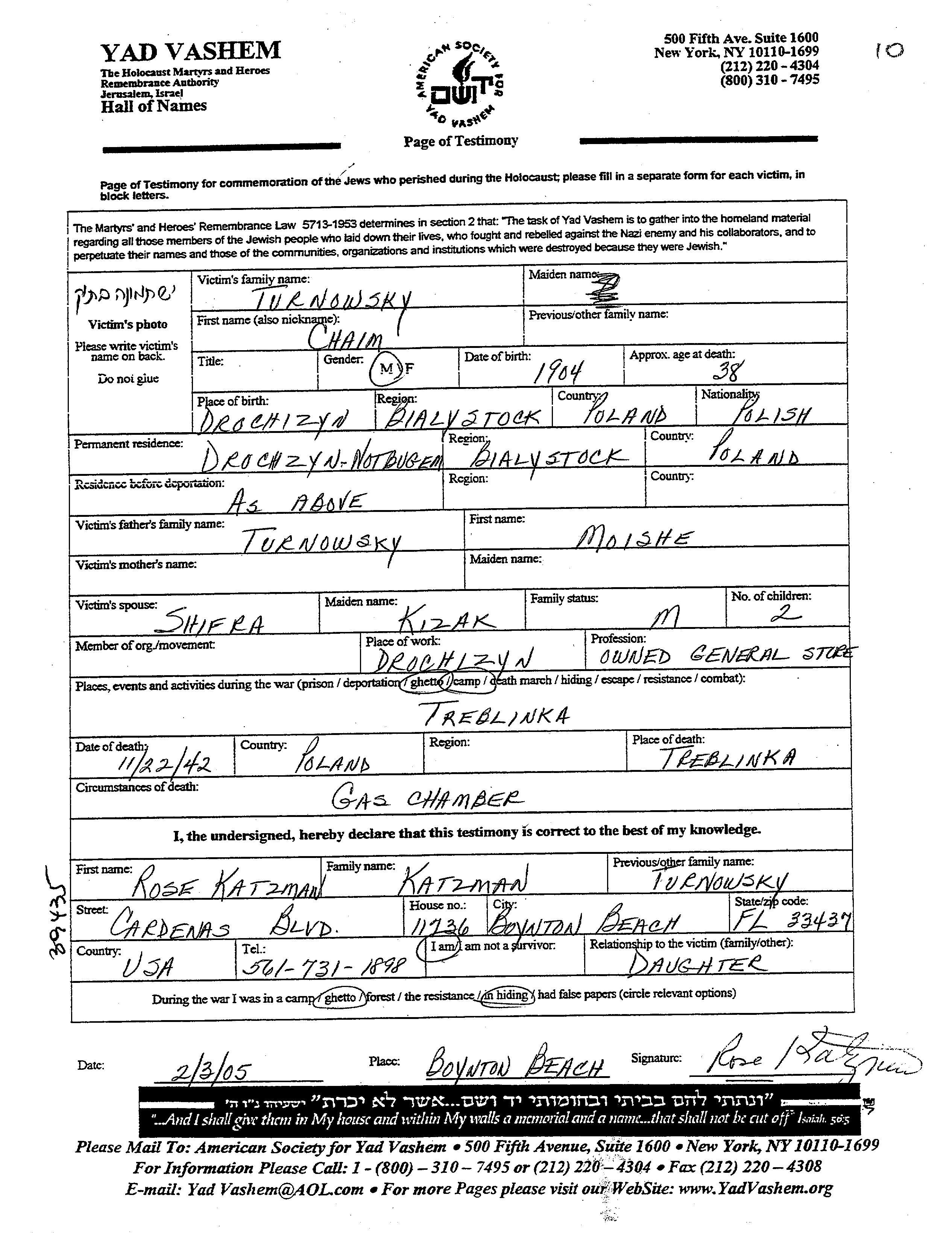 Chaim Turnowsky wurde im Jahr 1904 in Drohiczyn, Polen geboren. Er war General store owner. Vor dem Zweiten Weltkrieg lebte er in Drohiczyn, Polen.