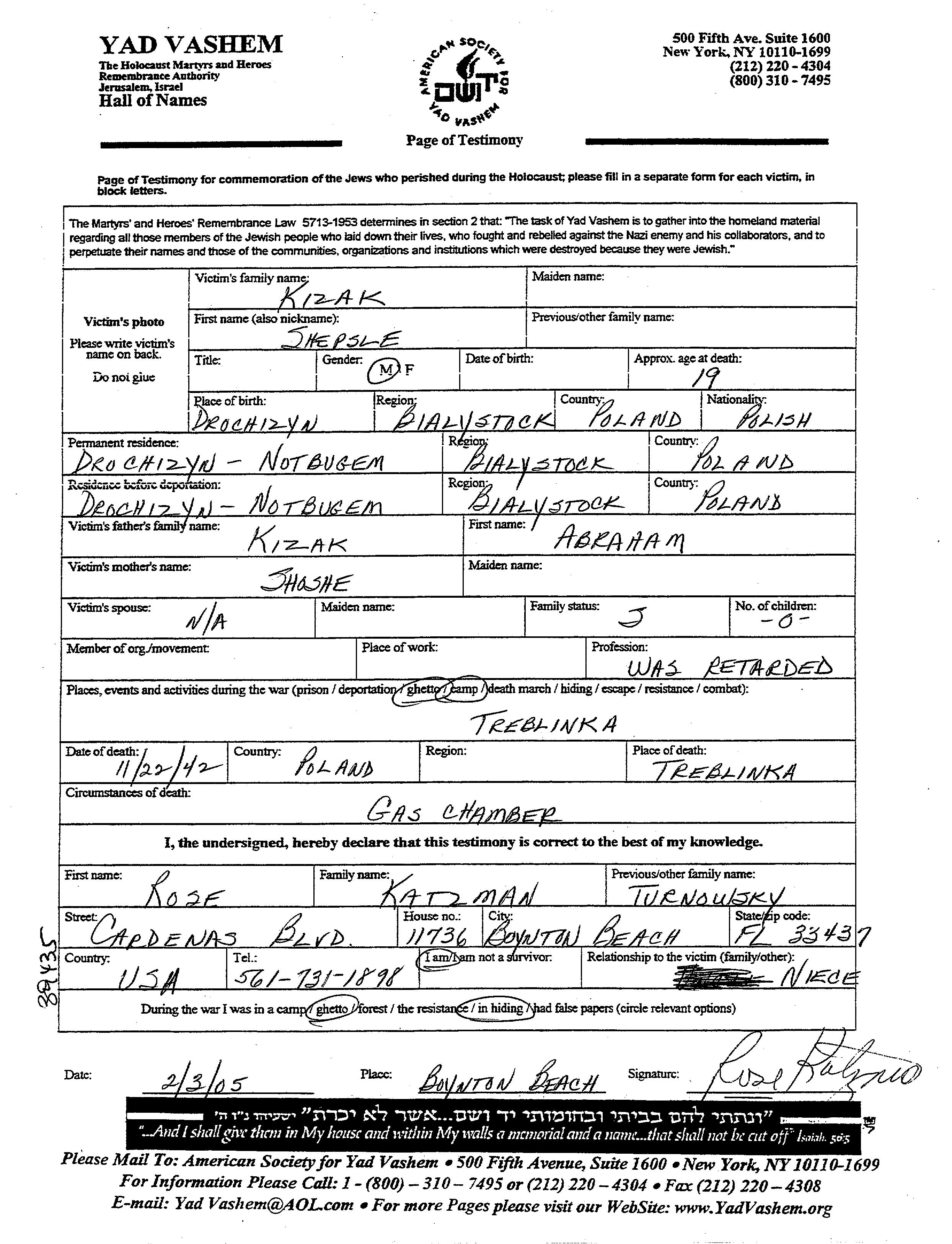 Shepsle Kizak wurde im Jahr 1923 in Drohiczyn, Polen geboren. Er war Einzelhändler. Vor dem Zweiten Weltkrieg lebte er in Drohiczyn, Polen.