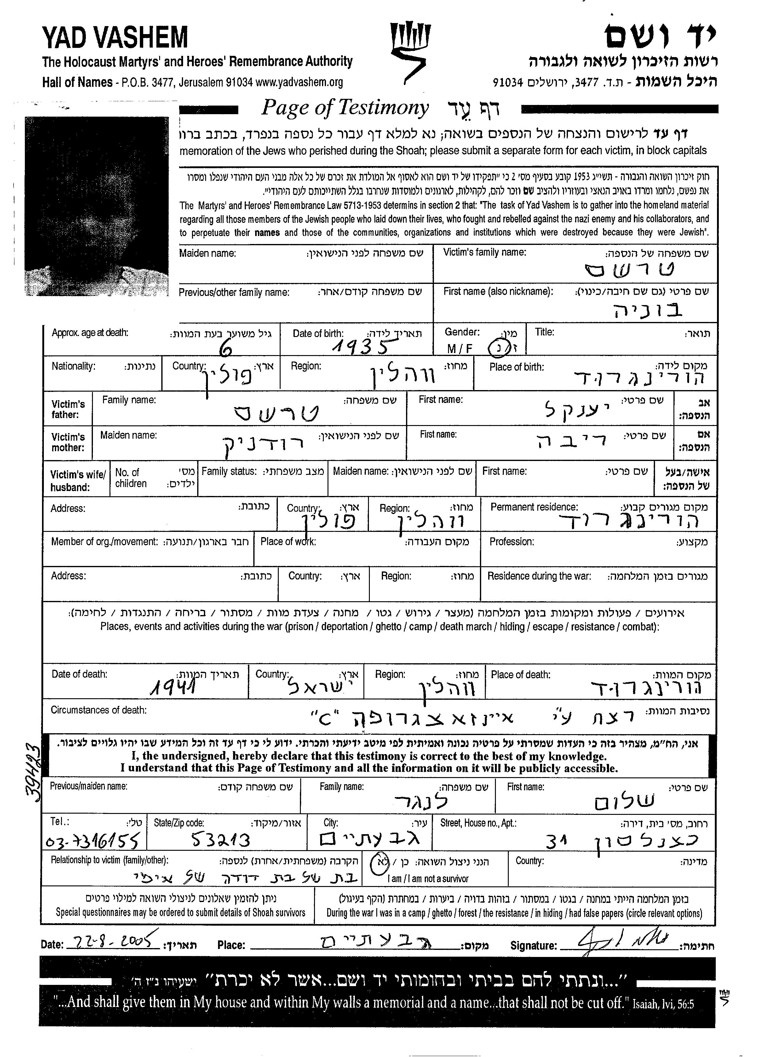 Bunia Tarshish wurde im Jahr 1935 in Horyngrod, Polen geboren. Vor dem Zweiten Weltkrieg lebte sie in Horyngrod, Polen.