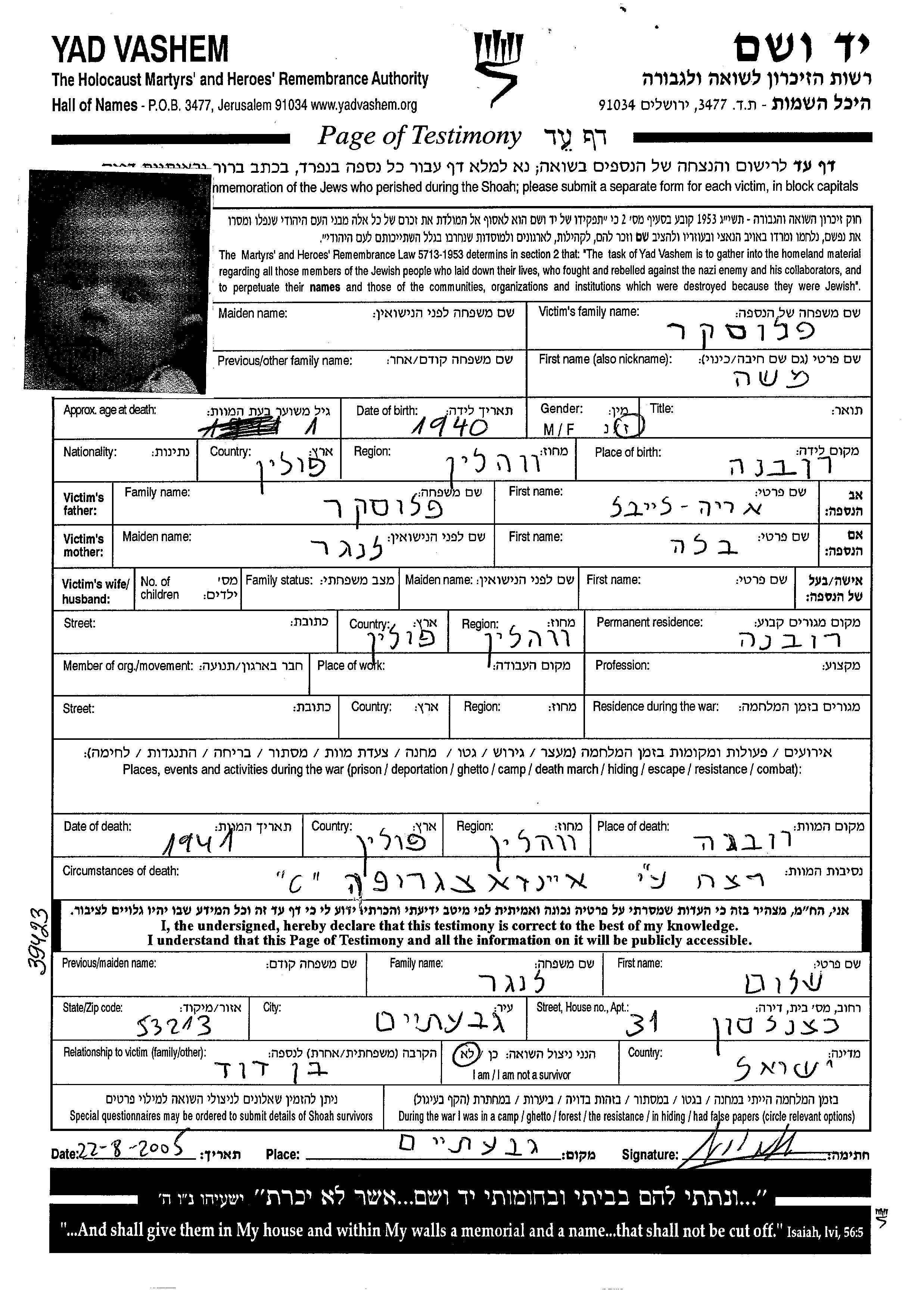 Plosker Moshe 1940 Rowne, Polen Gedenkblatt