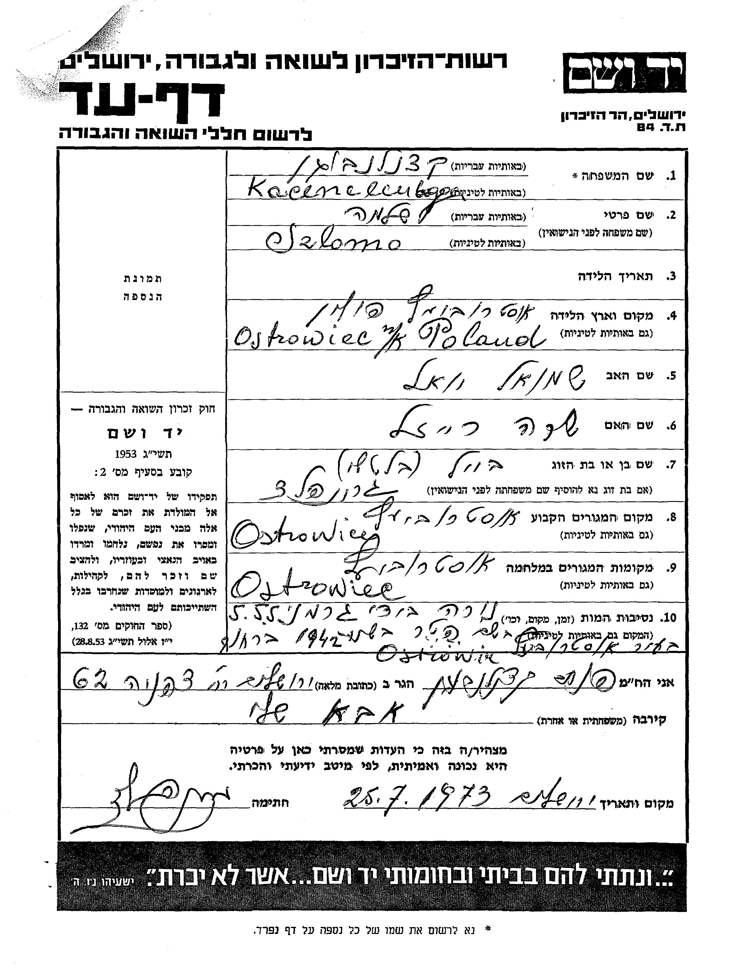 Szlomo wurde in der Schoah ermordet. Todesort: Ostrowiec, Polen im Jahr 1942.