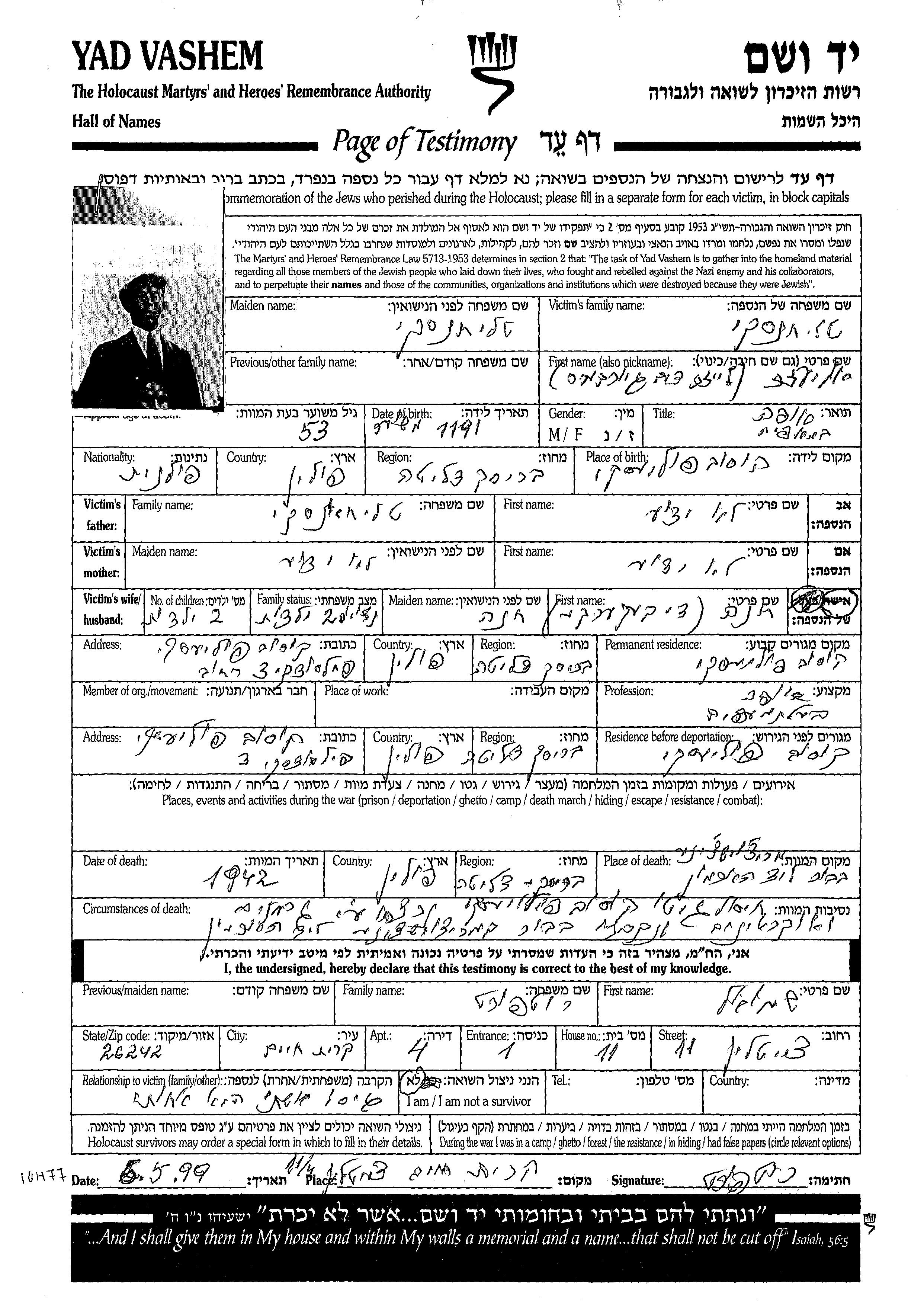 Eliezer wurde in der Schoah ermordet. Todesort: Kosow, Polen im Jahr 1942.