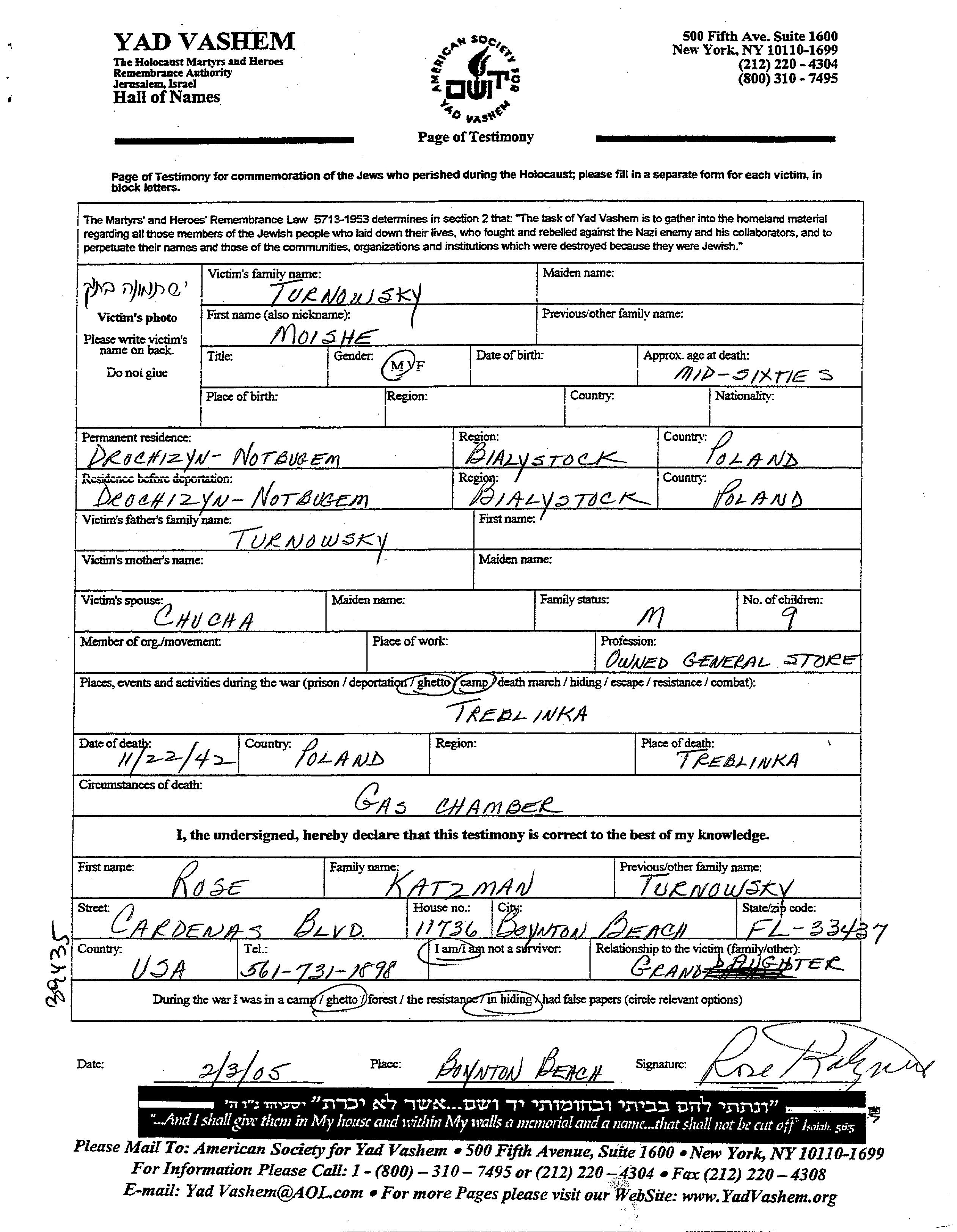 Moishe Turnowsky wurde im Jahr 1877 geboren. Er war General store owner. Vor dem Zweiten Weltkrieg lebte er in Drohiczyn, Polen.