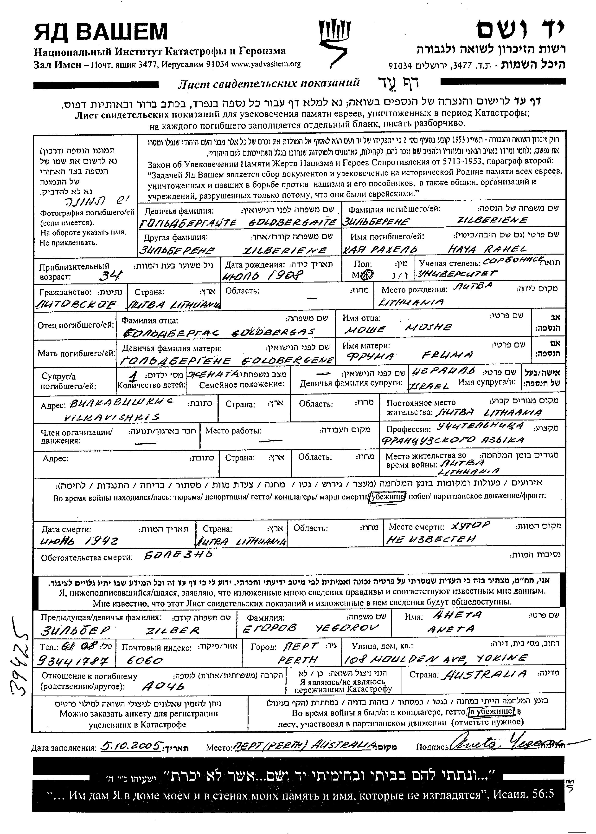 Khaya Rakhel Zilberiene, geb. Goldbergaite wurde im Jahr 1908 in Litauen geboren. Sie war Französischlehrer/in. Vor dem Zweiten Weltkrieg lebte sie in Vilkaviskis, Litauen. Khaya Rakhel wurde in der Schoah ermordet. Todesort: Litauen im Jahr 06/1942.