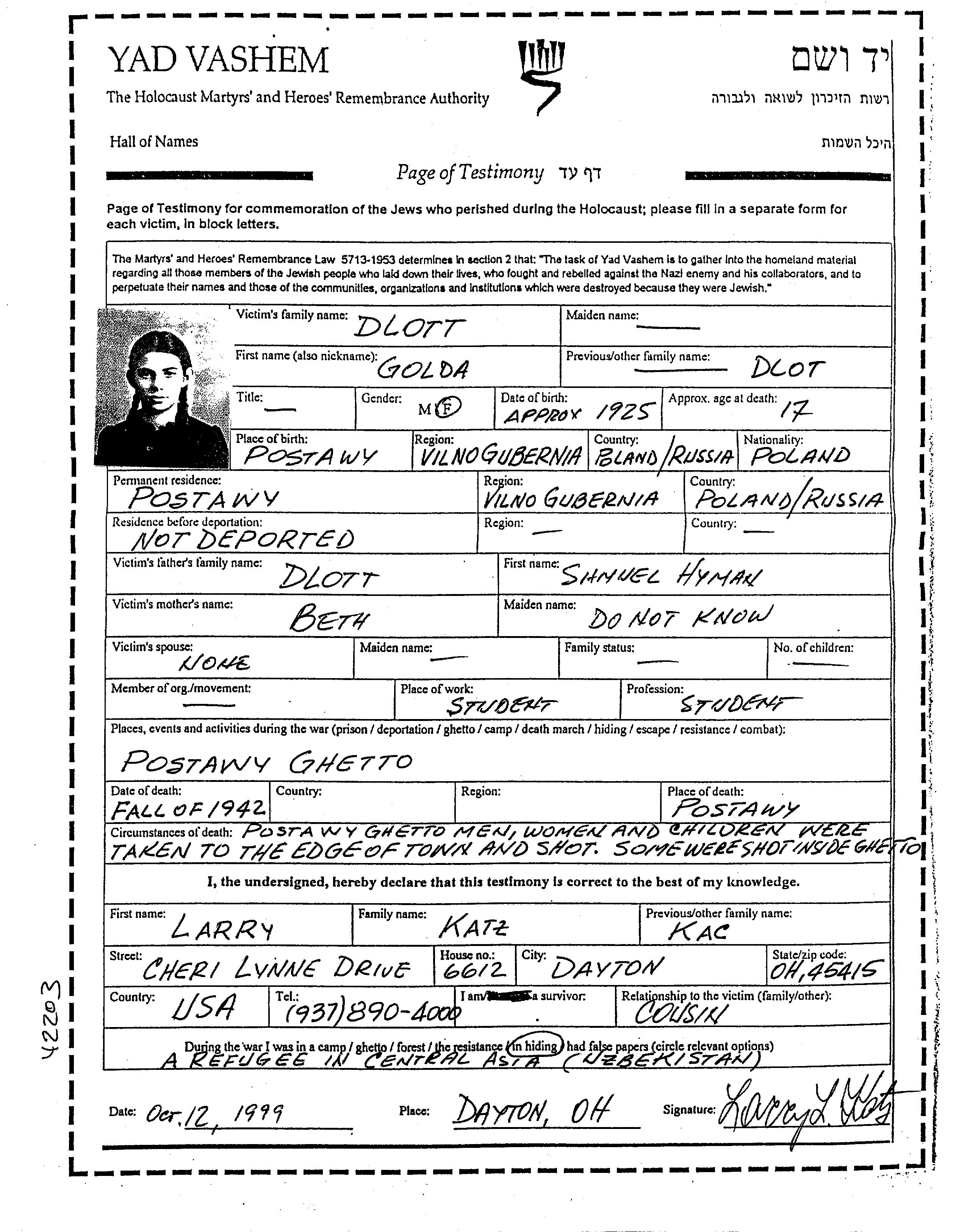 Golda Dlott wurde im Jahr 1925 in Postawy, Polen geboren. Sie war Student. Vor dem Zweiten Weltkrieg lebte sie in Postawy, Polen.