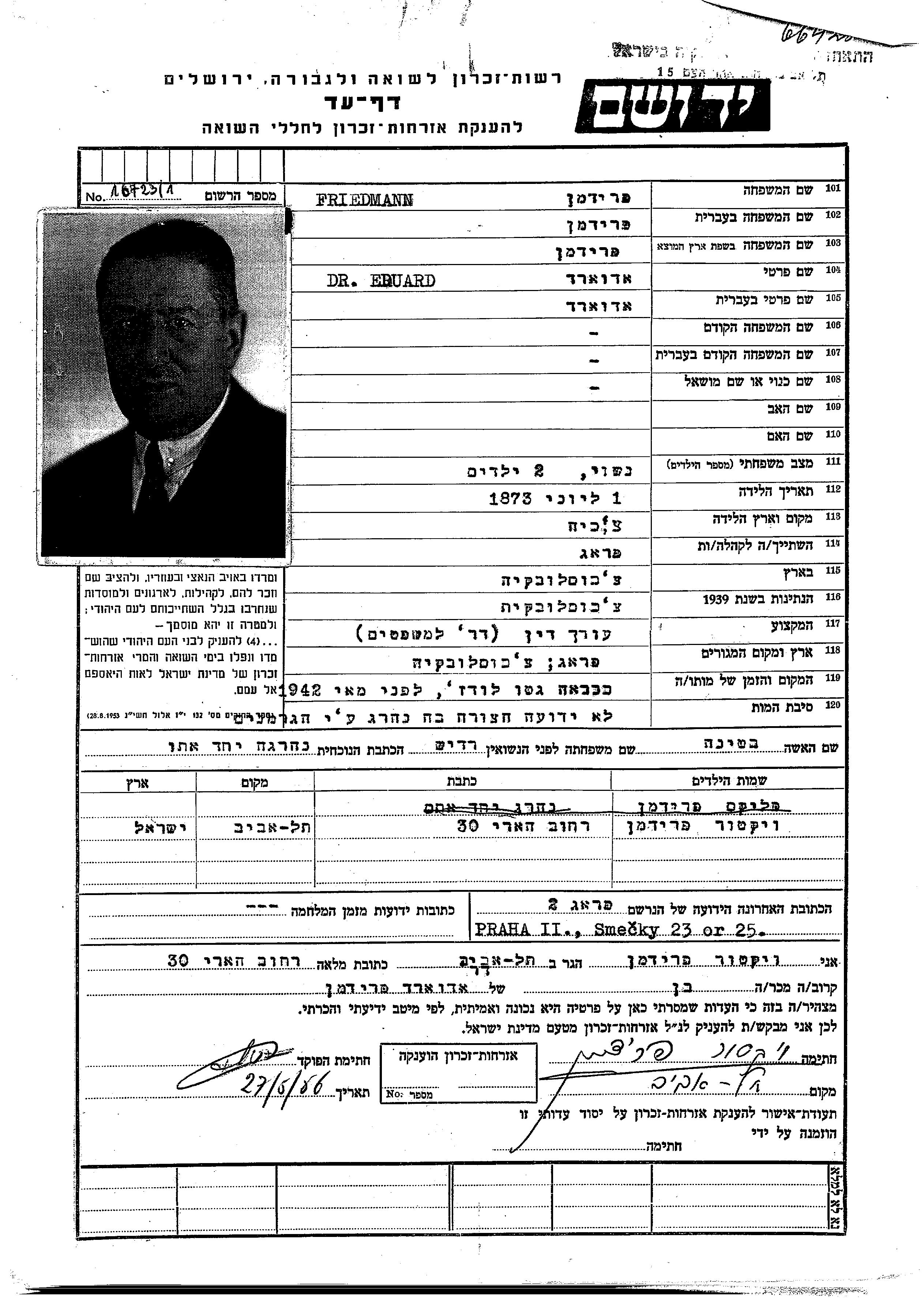 Eduard Friedmann wurde im Jahr 1873 in Tschechoslowakei geboren. Er war Jurist. Vor dem Zweiten Weltkrieg lebte er in Praha, Tschechoslowakei.