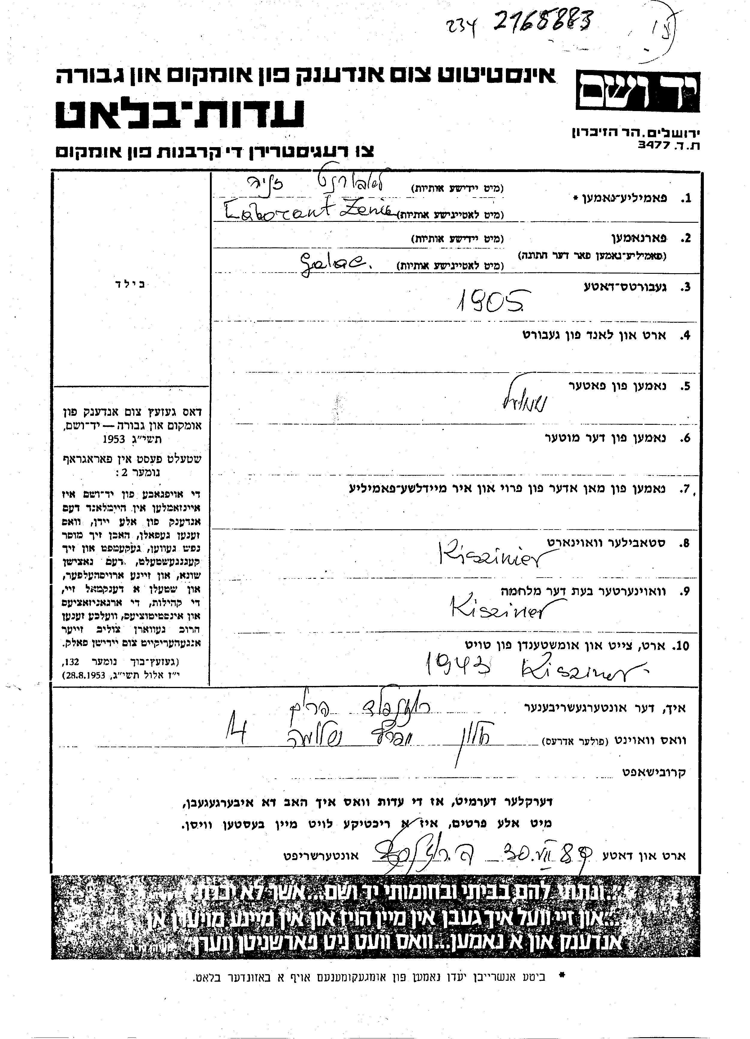 Zenia Zhenia wurde in der Schoah ermordet. Todesort: Kishinev, Rumänien im Jahr 1943.