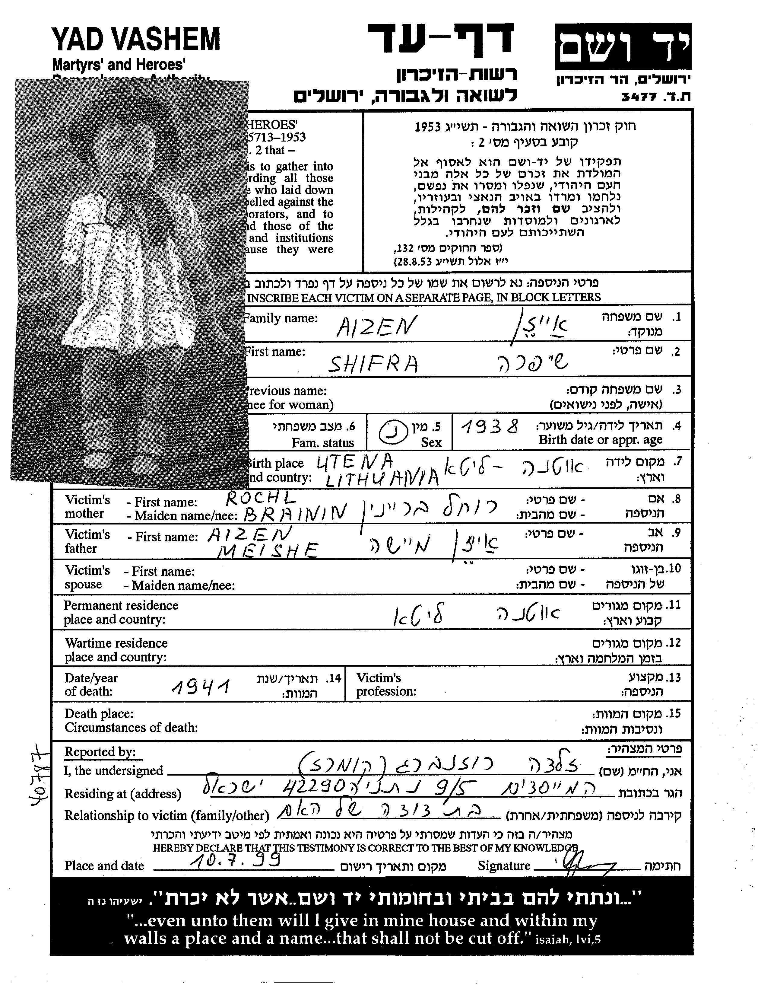 Shifra Eizen wurde im Jahr 1938 in Utena, Litauen geboren. Vor dem Zweiten Weltkrieg lebte sie in Utena, Litauen.