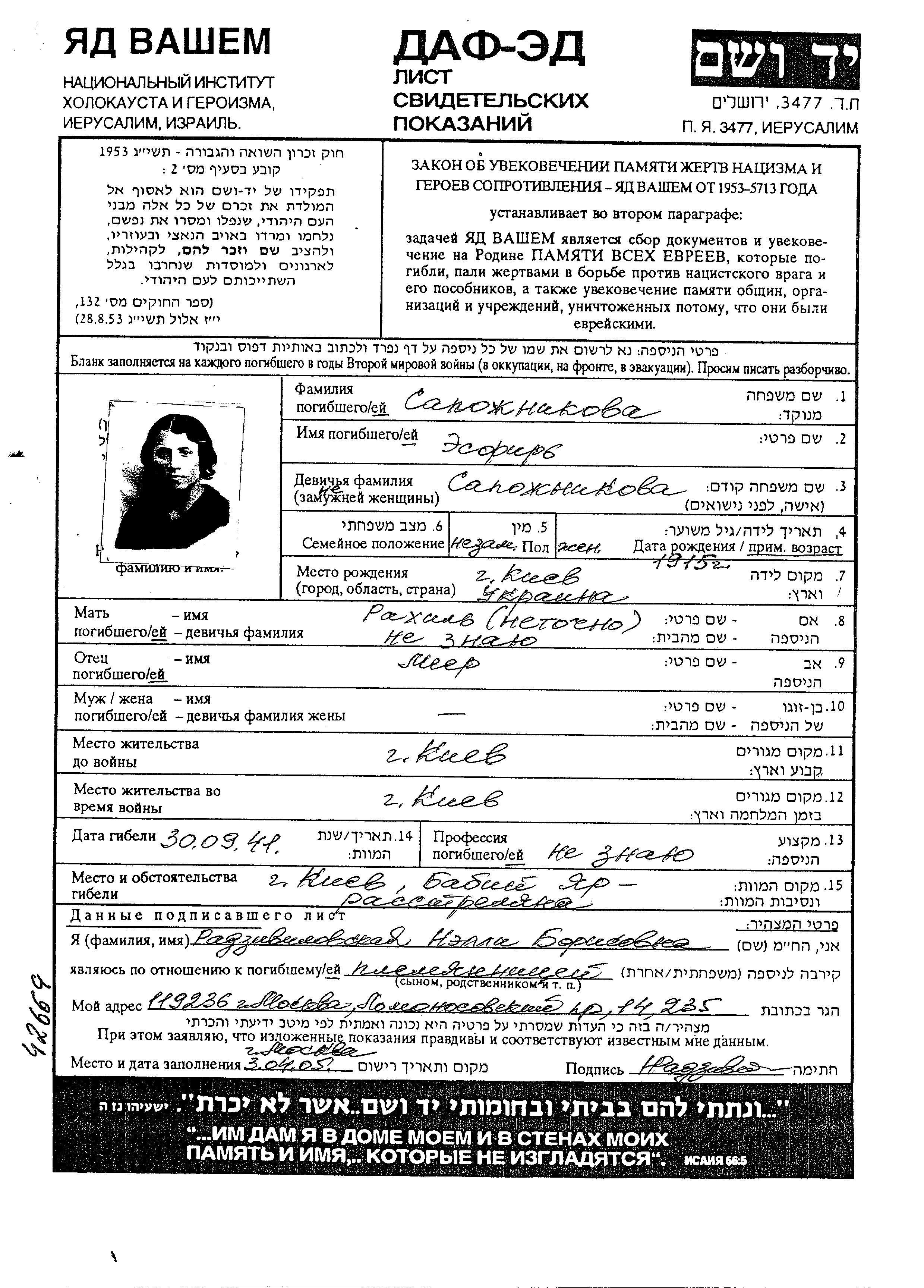 Sapozhnikova Esfir 1915 Kiev, Ukraine (UdSSR) Gedenkblatt