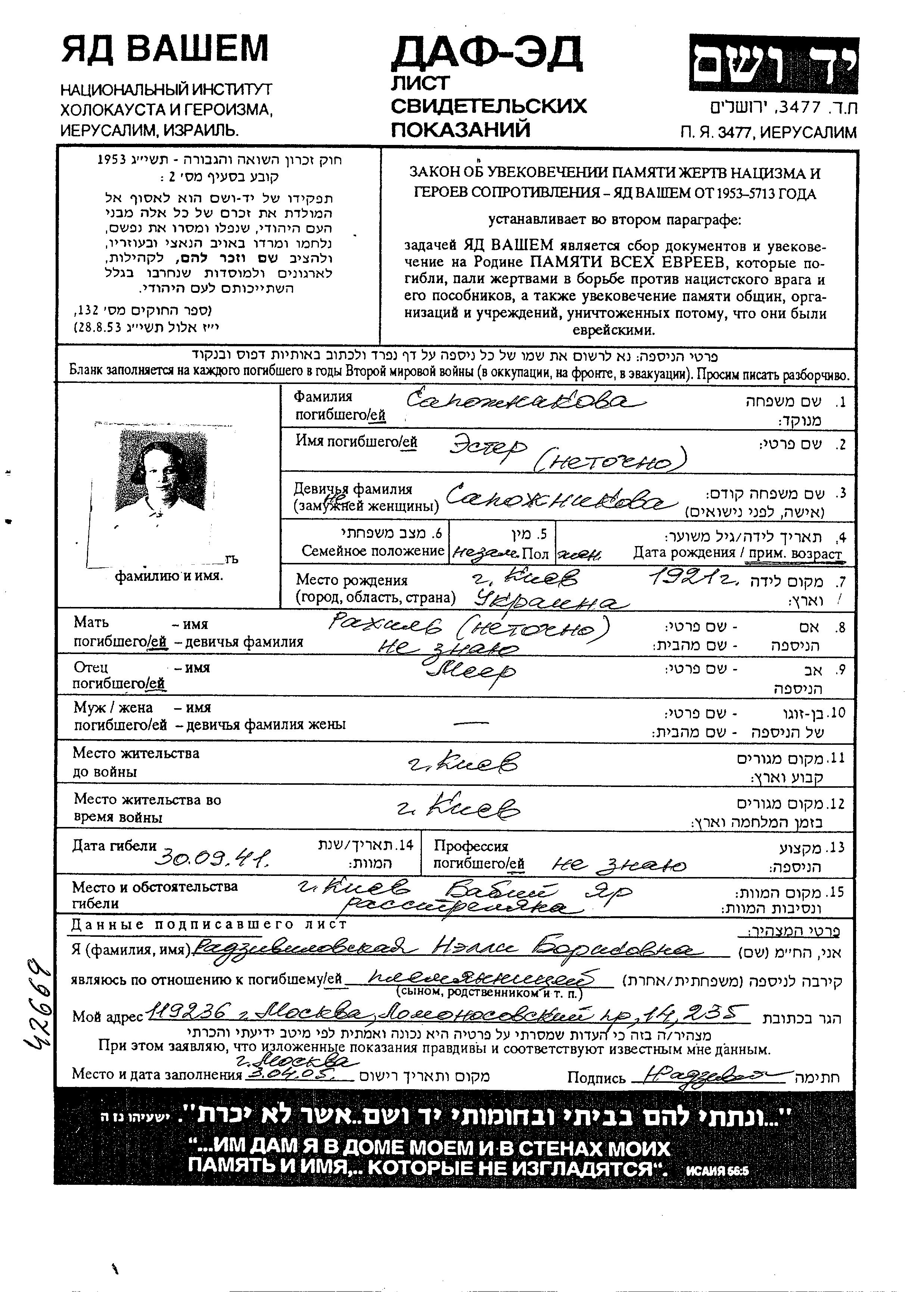 Sapozhnikova | Ester | 1921 | Kiev, Ukraine (UdSSR) | Gedenkblatt |