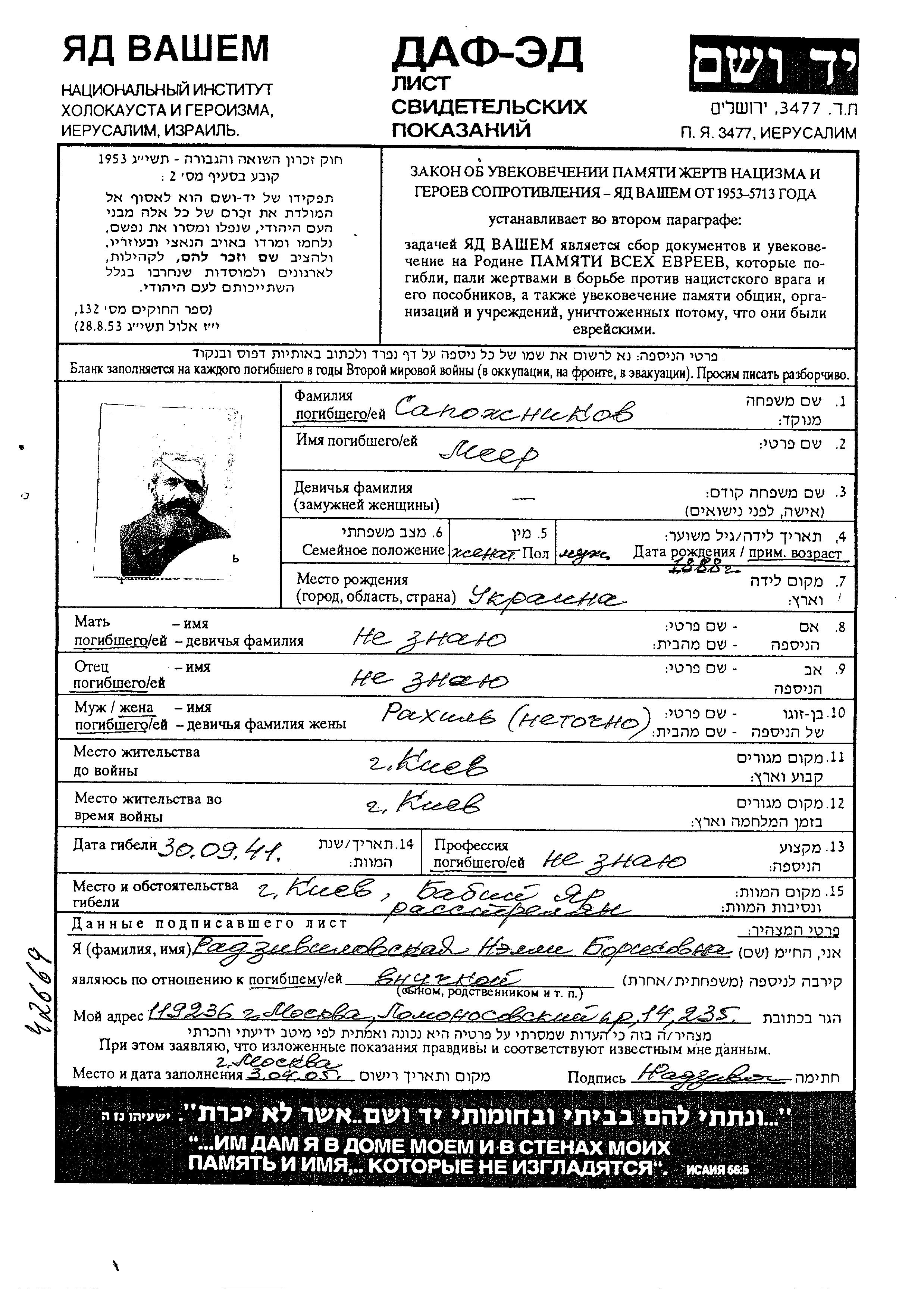 Meyer Sapozhnikov wurde im Jahr 1888 in Ukraine (UdSSR) geboren. Vor dem Zweiten Weltkrieg lebte er in Kiev, Ukraine (UdSSR).