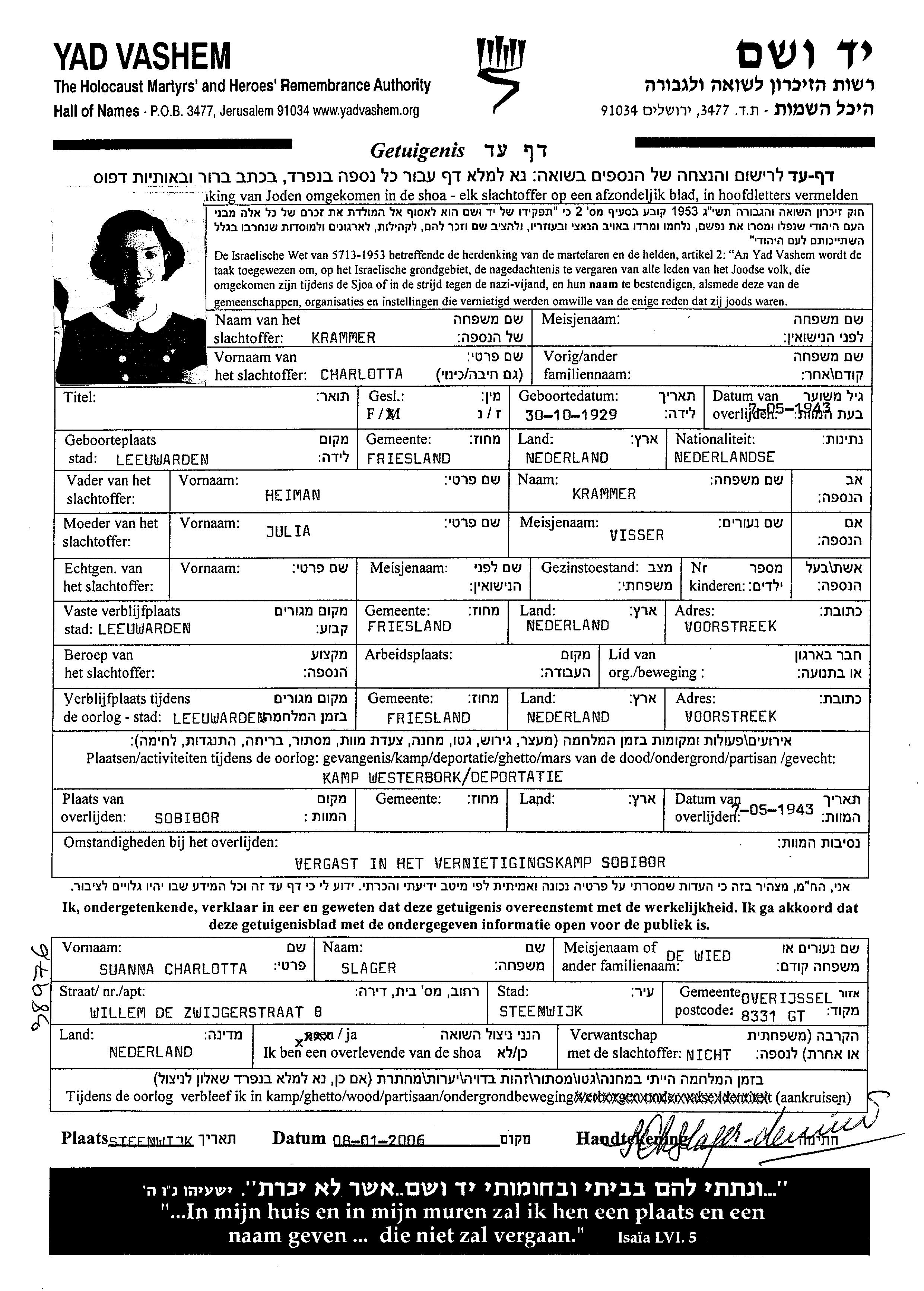 Charlotta wurde in der Schoah ermordet. Todesort: Sobibor, Polen im Jahr 07/05/1943.
