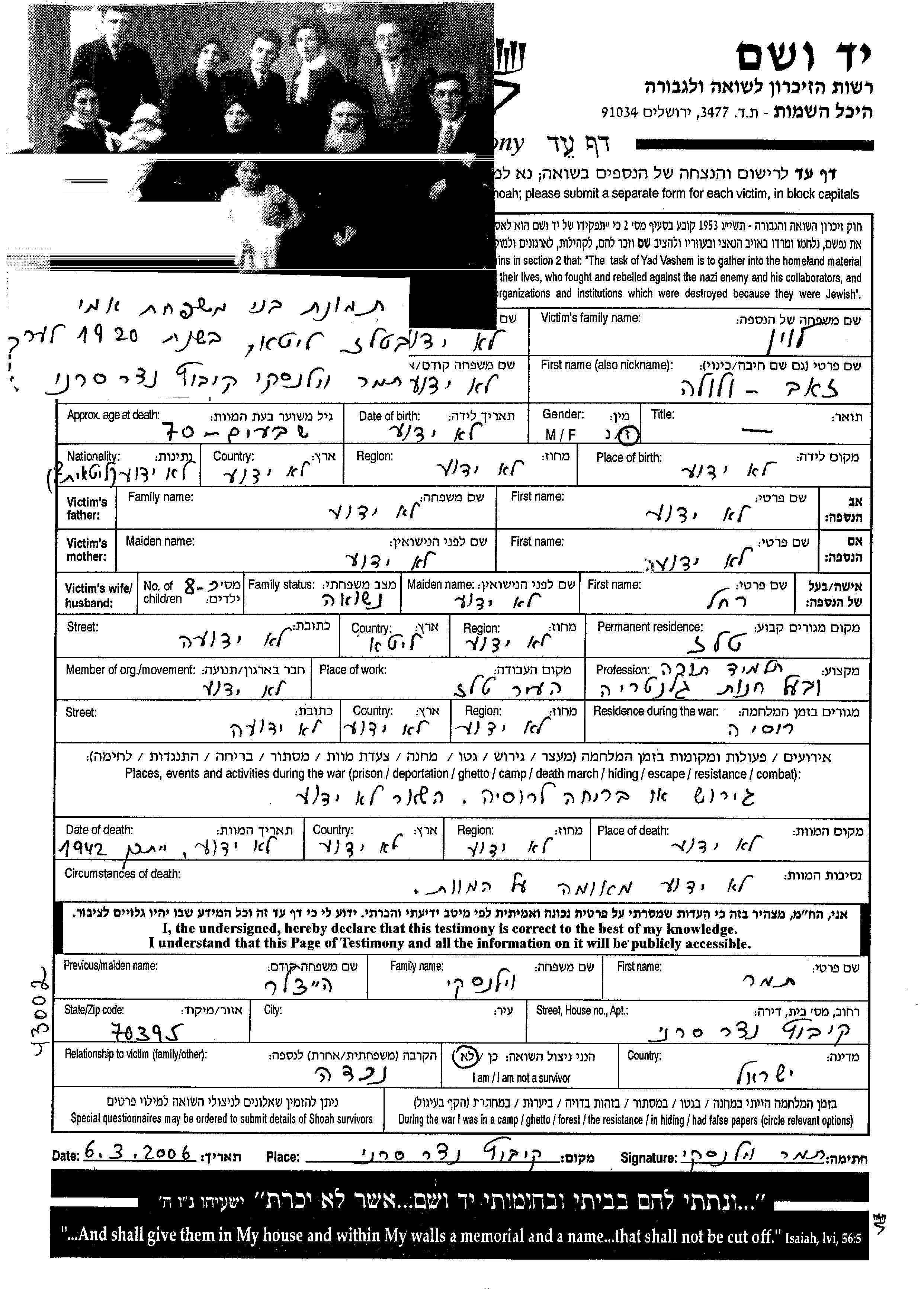 Zeev Volf wurde in der Schoah ermordet. Todesort: unbekannter Ort im Jahr 1942.