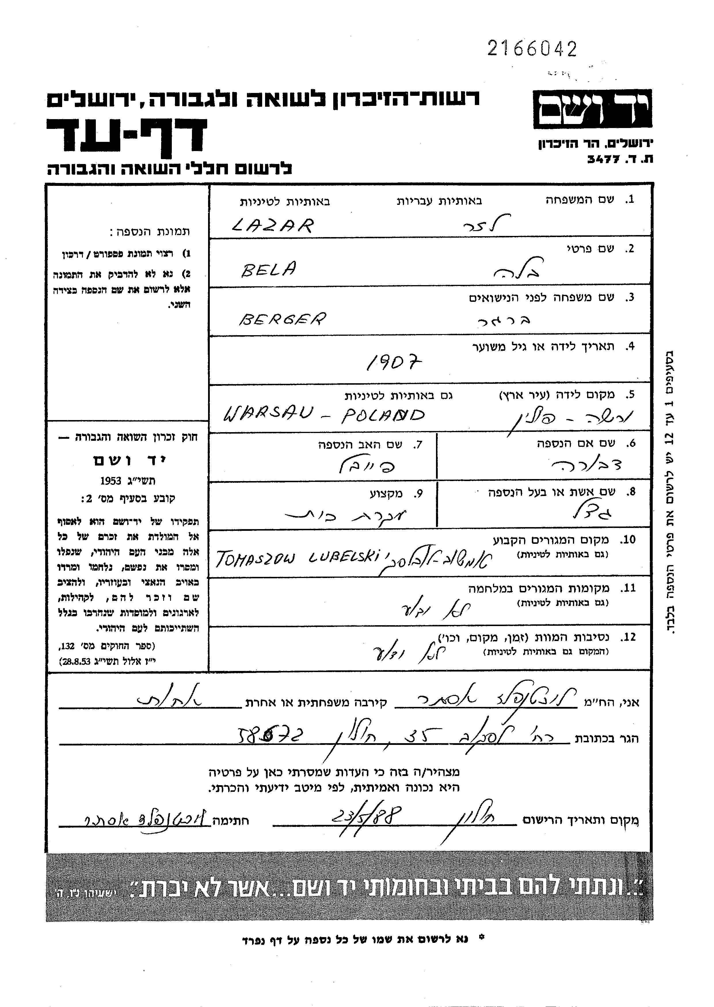 Bela Lazar, geb. Berger wurde im Jahr 1907 in Warszawa, Polen geboren. Sie war die Tochter von Faivel und Dvora. Sie war Hausfrau und mit Gedal Verheiratet. Vor dem Zweiten Weltkrieg lebte sie in Tomaszow, Polen.