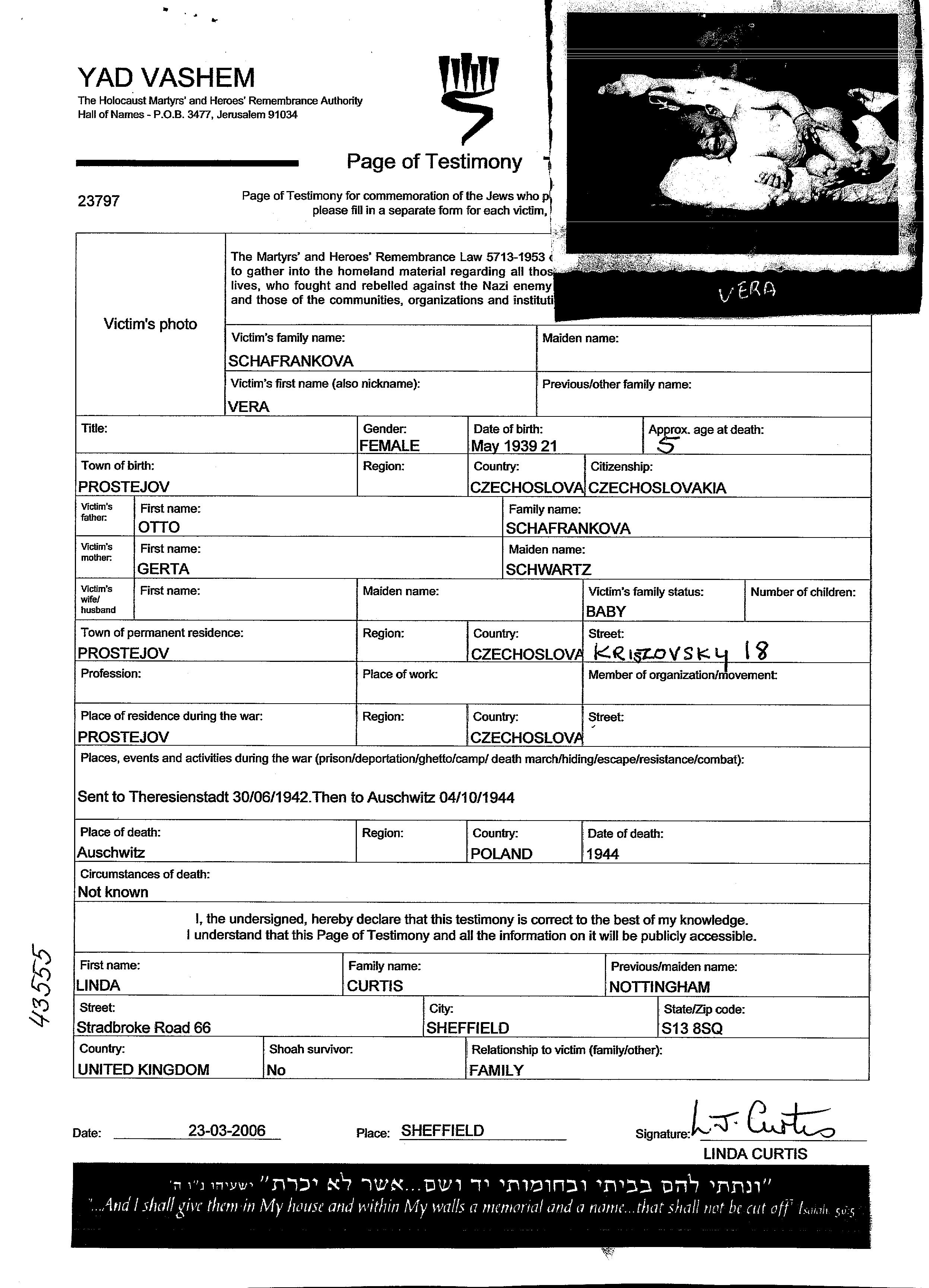 | Schafrankova | Vera | 1939 | Prostejov, Tschechoslowakei | Gedenkblatt (digital, unterzeichnet) |