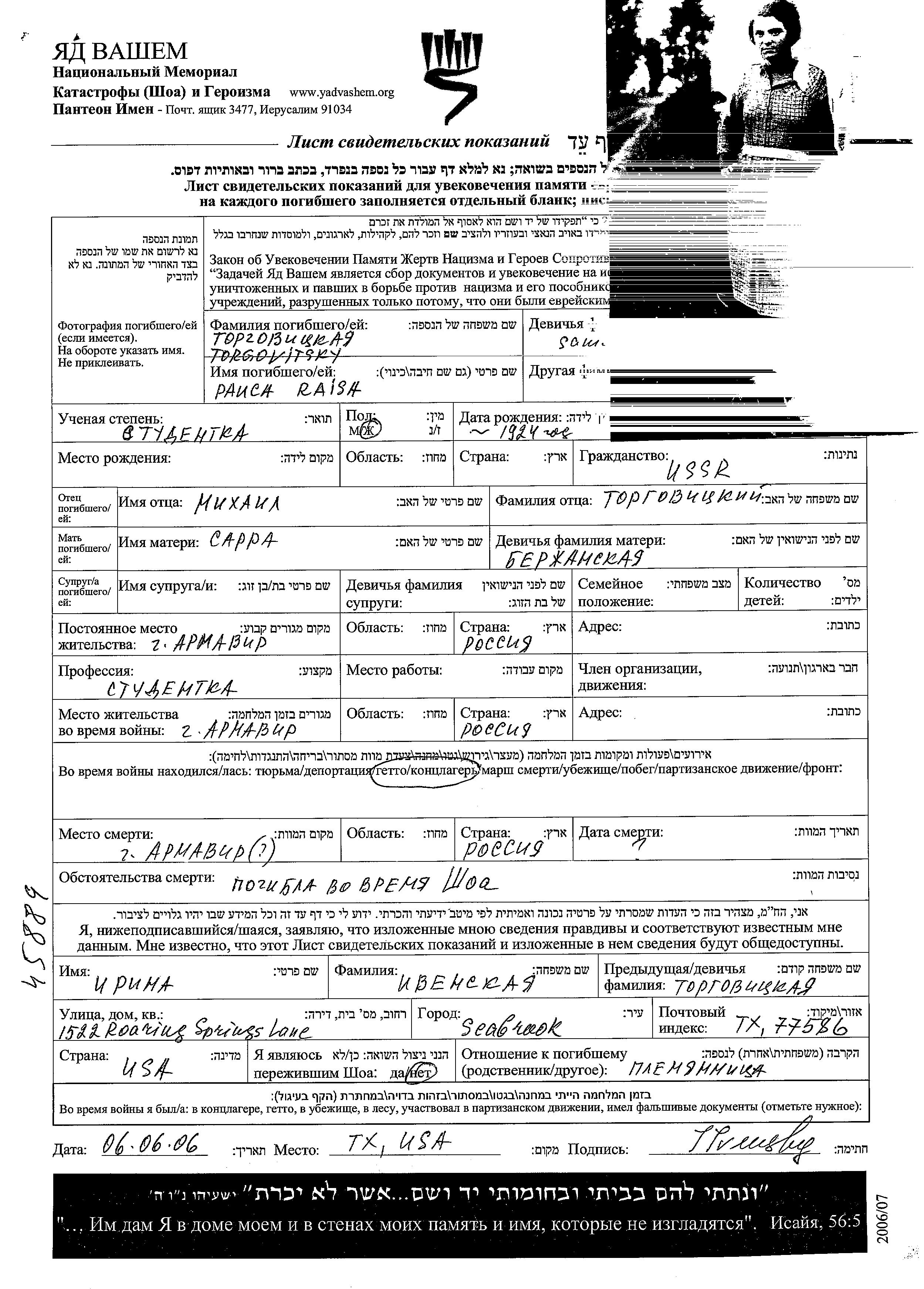 Raisa wurde in der Schoah ermordet. Todesort: Armavir, Russland (UdSSR).