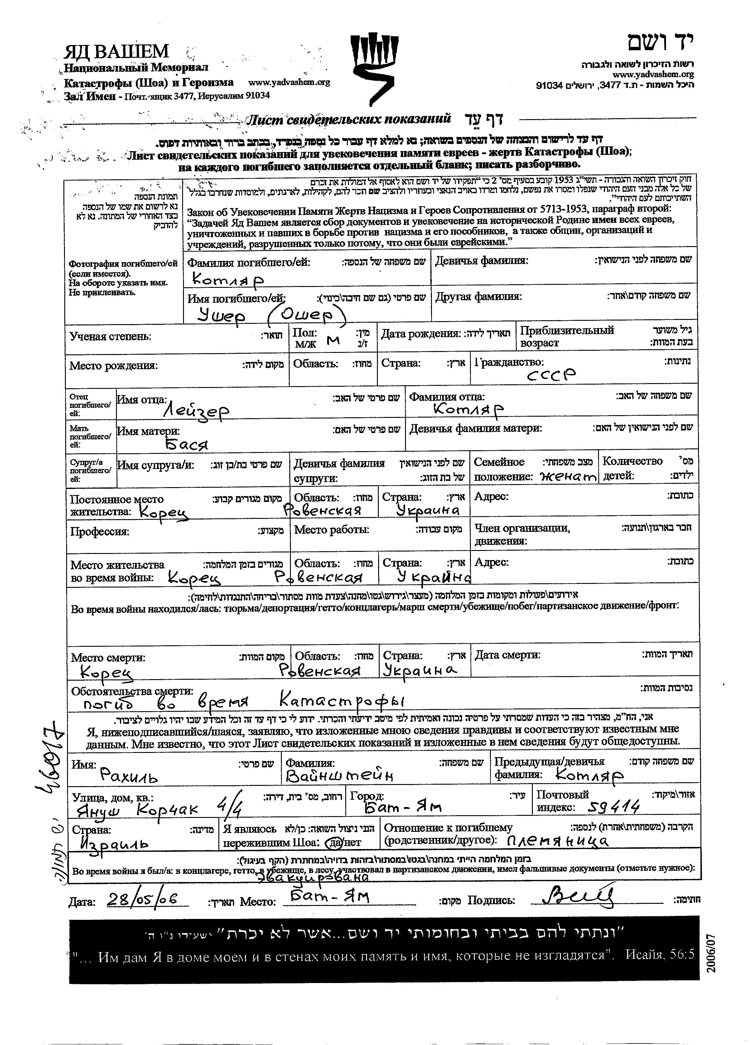 Usher wurde in der Schoah ermordet. Todesort: Korzec, Polen.