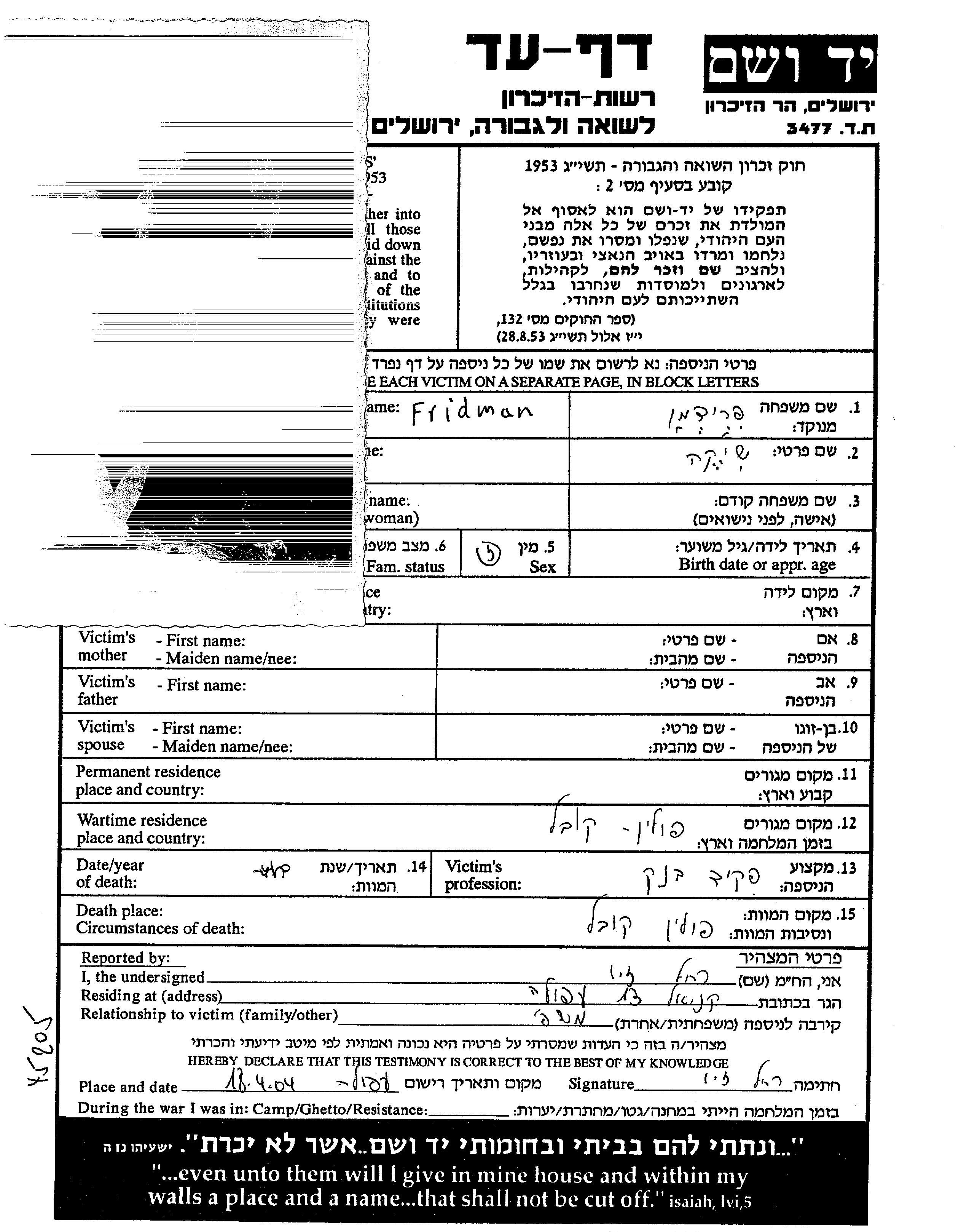 Shika Fridman. Er war Bankangestellte/-r. Vor dem Zweiten Weltkrieg lebte er in Kowel, Polen.