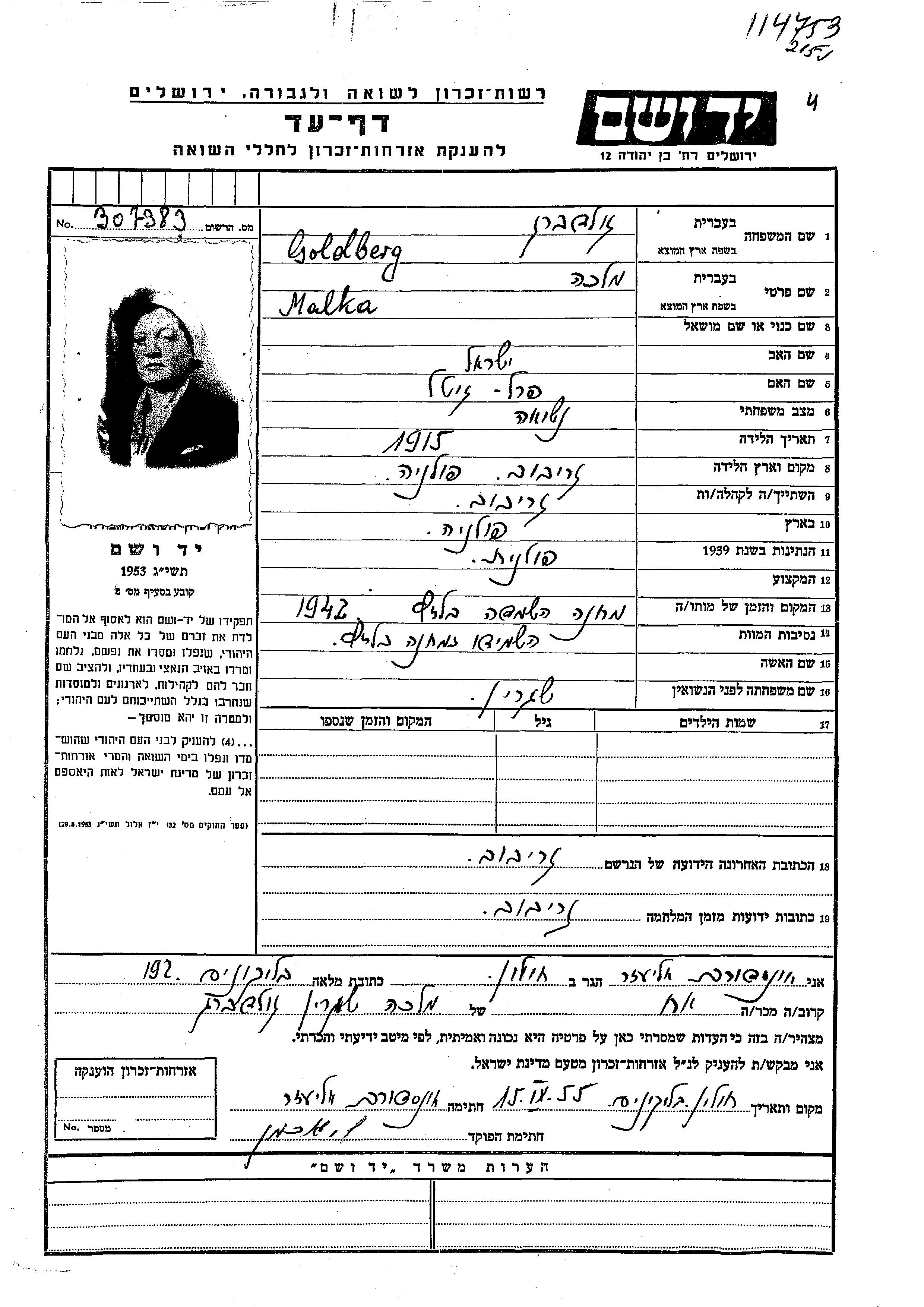 Malka wurde in der Schoah ermordet. Todesort: Belzec, Polen im Jahr 1942.