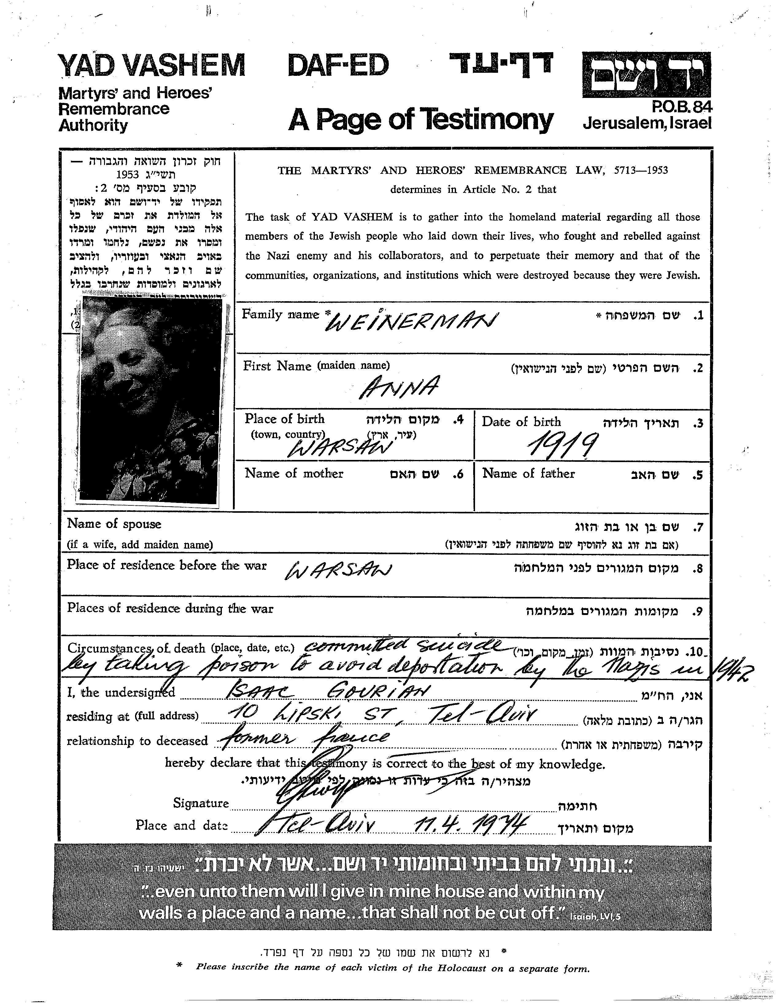 Weinerman Anna 1919 Warsaw, Polen Gedenkblatt