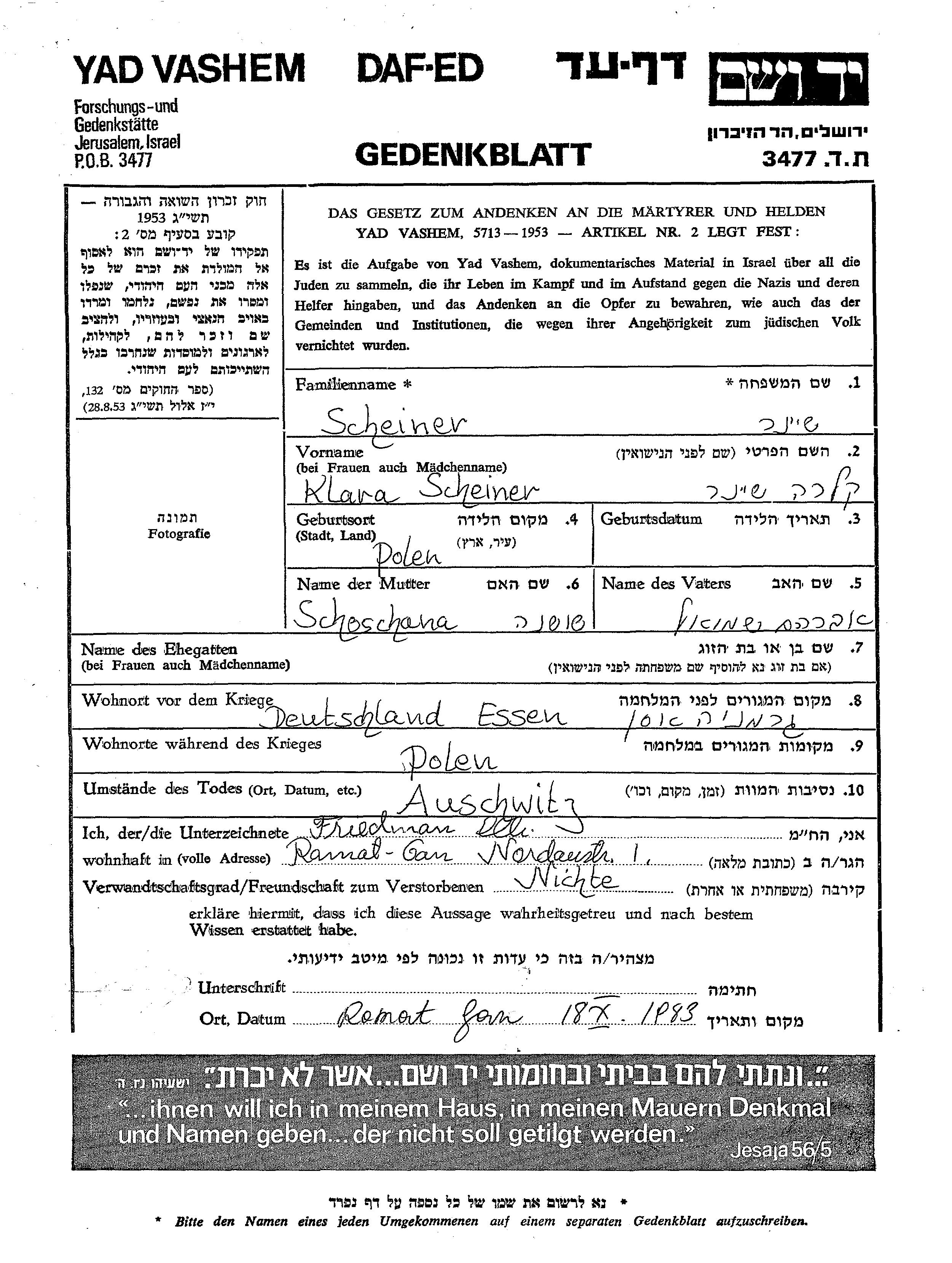 Klara Sheiner wurde in Polen geboren. Vor dem Zweiten Weltkrieg lebte sie in Essen, Deutsches Reich.