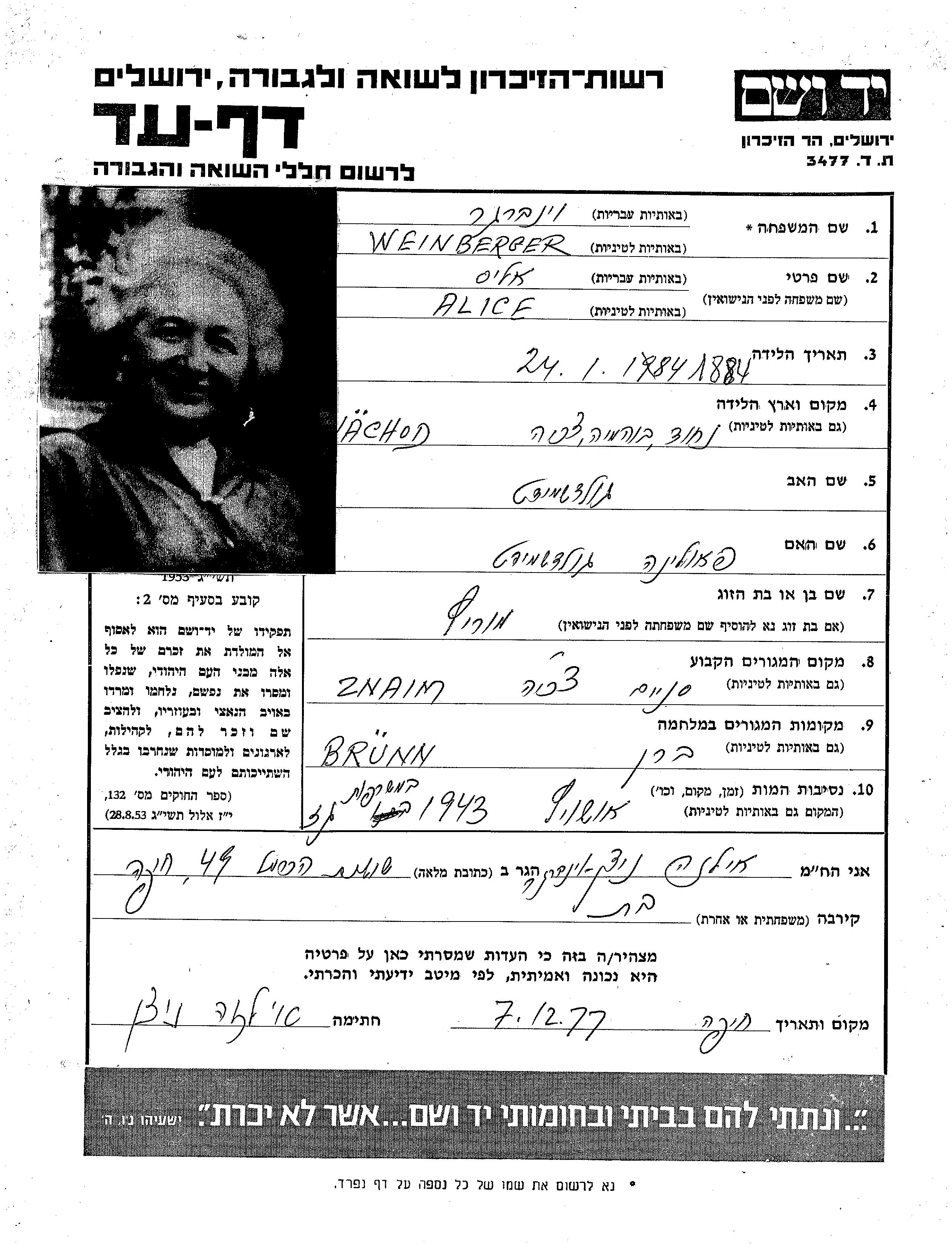 Weinberger | Alice Ellis | 1884 | Znaim, Tschechoslowakei | Gedenkblatt |