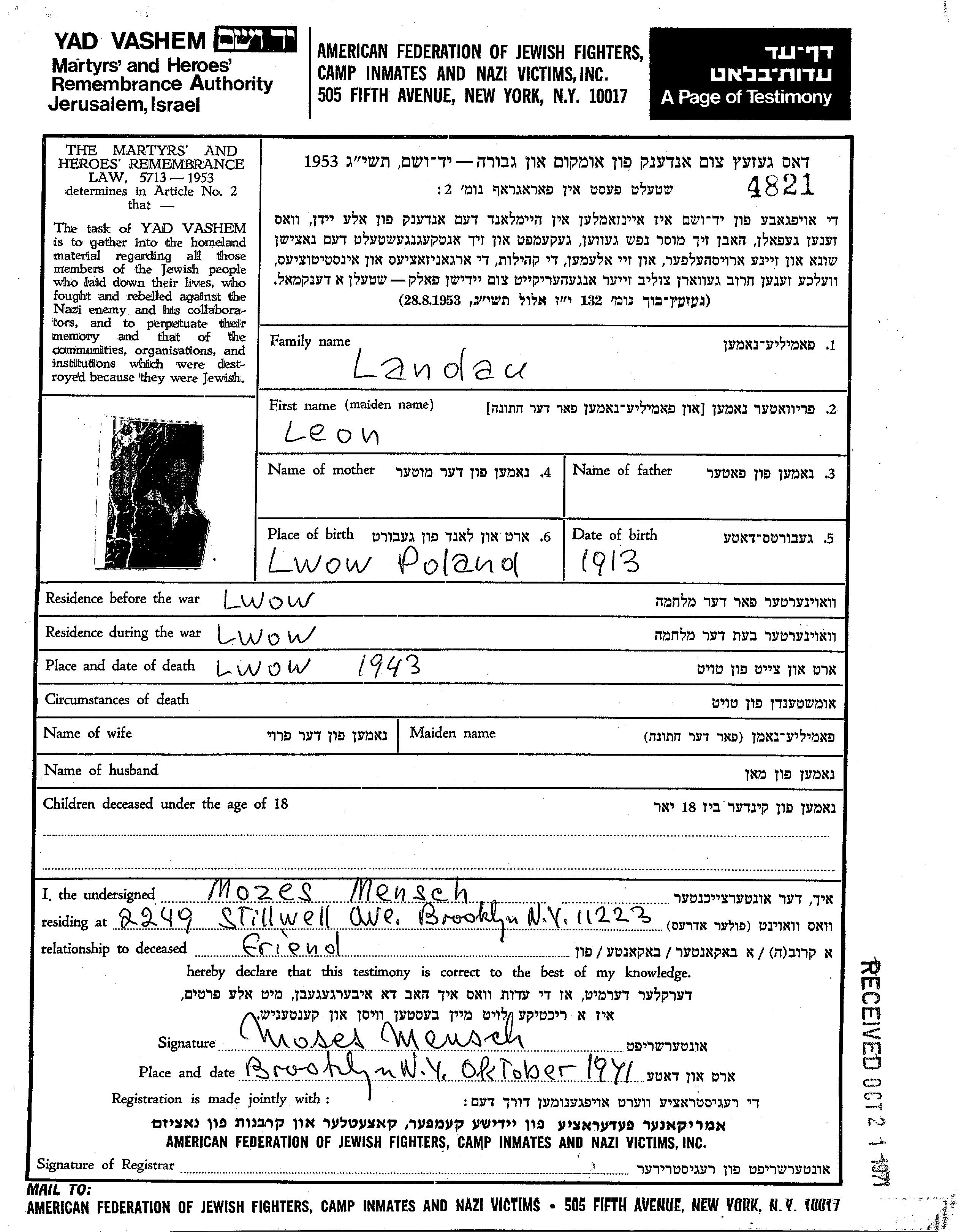 Leon Landau wurde im Jahr 1913 in Lwow, Polen geboren. Vor dem Zweiten Weltkrieg lebte er in Lwow, Polen.
