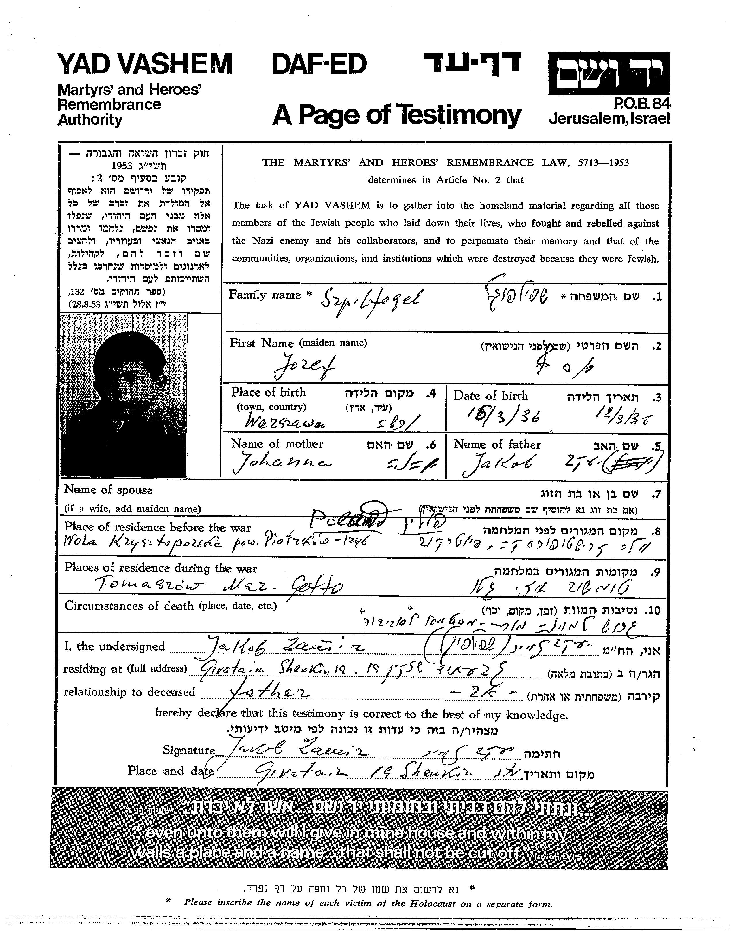 Jozef Szpilfogel wurde im Jahr 1936 in Warszawa, Polen geboren. Vor dem Zweiten Weltkrieg lebte er in Piotrkow, Polen.