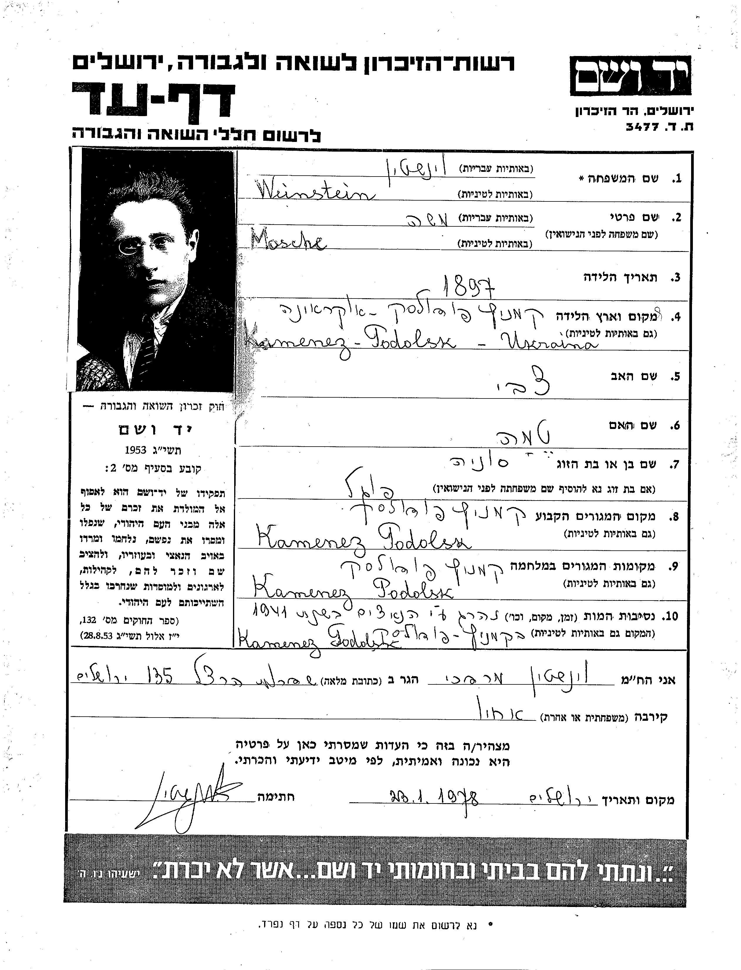 Mosche Weinstein wurde im Jahr 1897 in Kamieniec Litewski, Polen geboren. Vor dem Zweiten Weltkrieg lebte er in Kamieniec Litewski, Polen.
