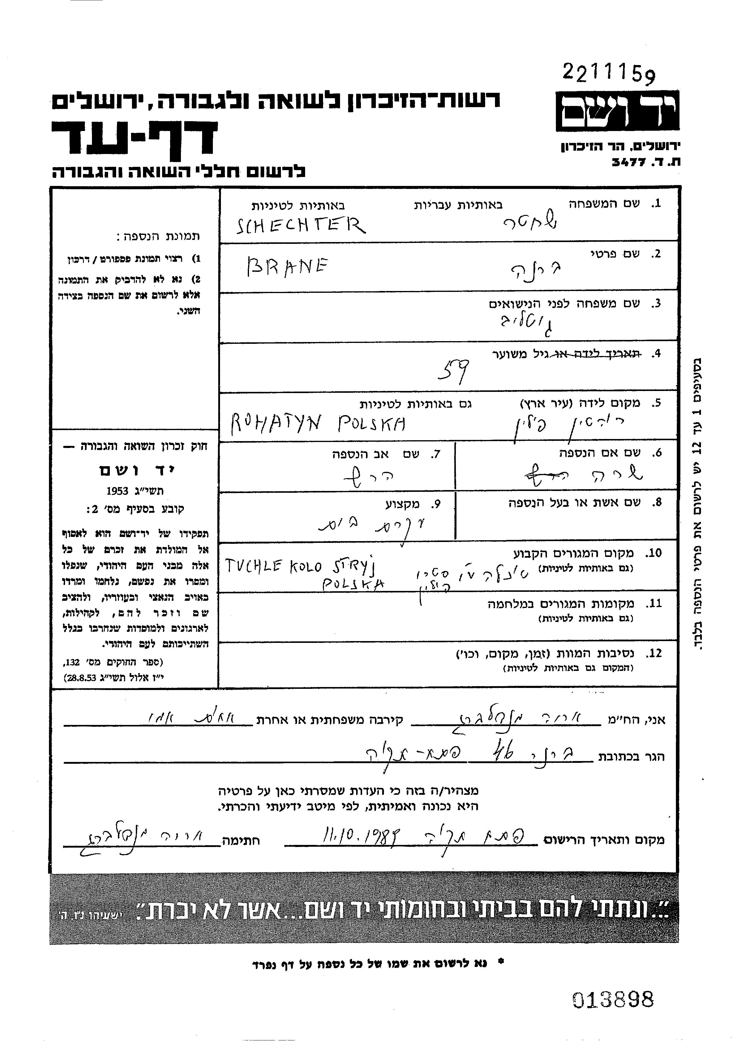 Brane Schechter, geb. Gotlib wurde in Rohatyn, Polen geboren. Sie war die Tochter von Hersh und Sara. Sie war Hausfrau. Vor dem Zweiten Weltkrieg lebte sie in Tuchla, Polen.