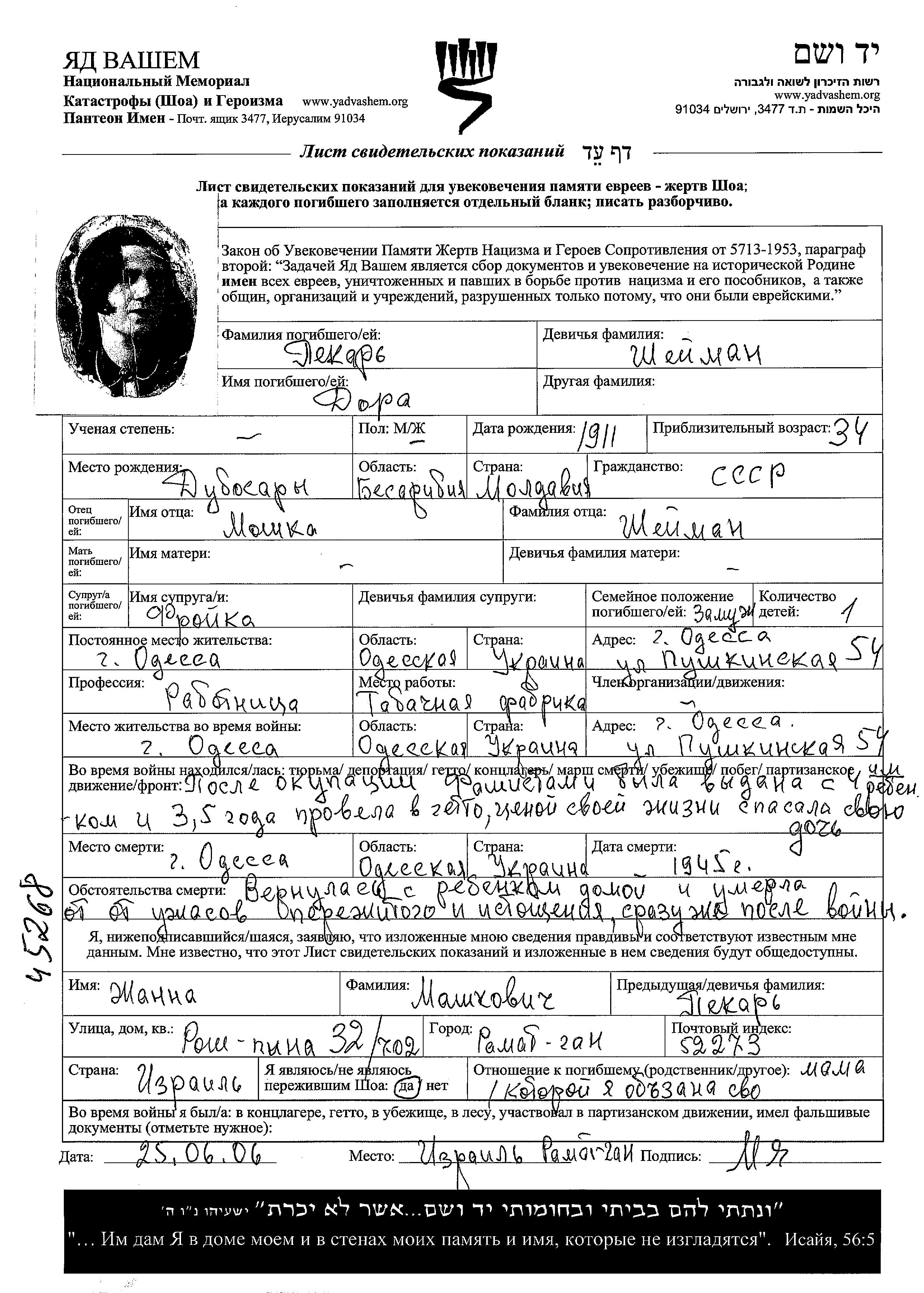 Dora Peker, geb. Sheiman wurde im Jahr 1911 in Dubossary, Ukraine (UdSSR) geboren. Sie war Rabotnitza fabriki. Vor dem Zweiten Weltkrieg lebte sie in Odessa, Ukraine (UdSSR).