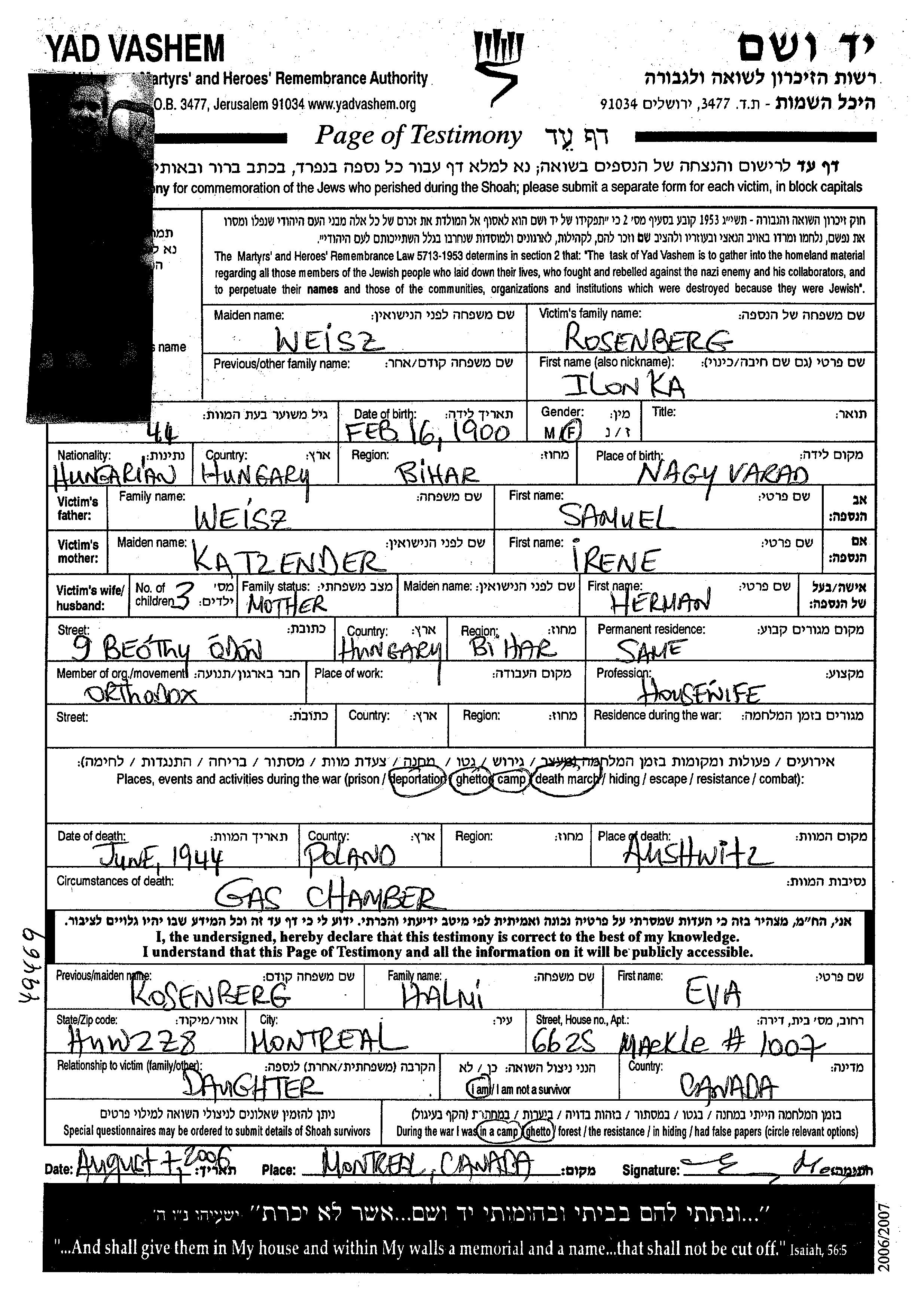 Ilonka Rosenberg, geb. Weisz wurde im Jahr 1900 in Oradea, Rumänien geboren. Sie war Hausfrau. Vor dem Zweiten Weltkrieg lebte sie in Oradea, Rumänien.