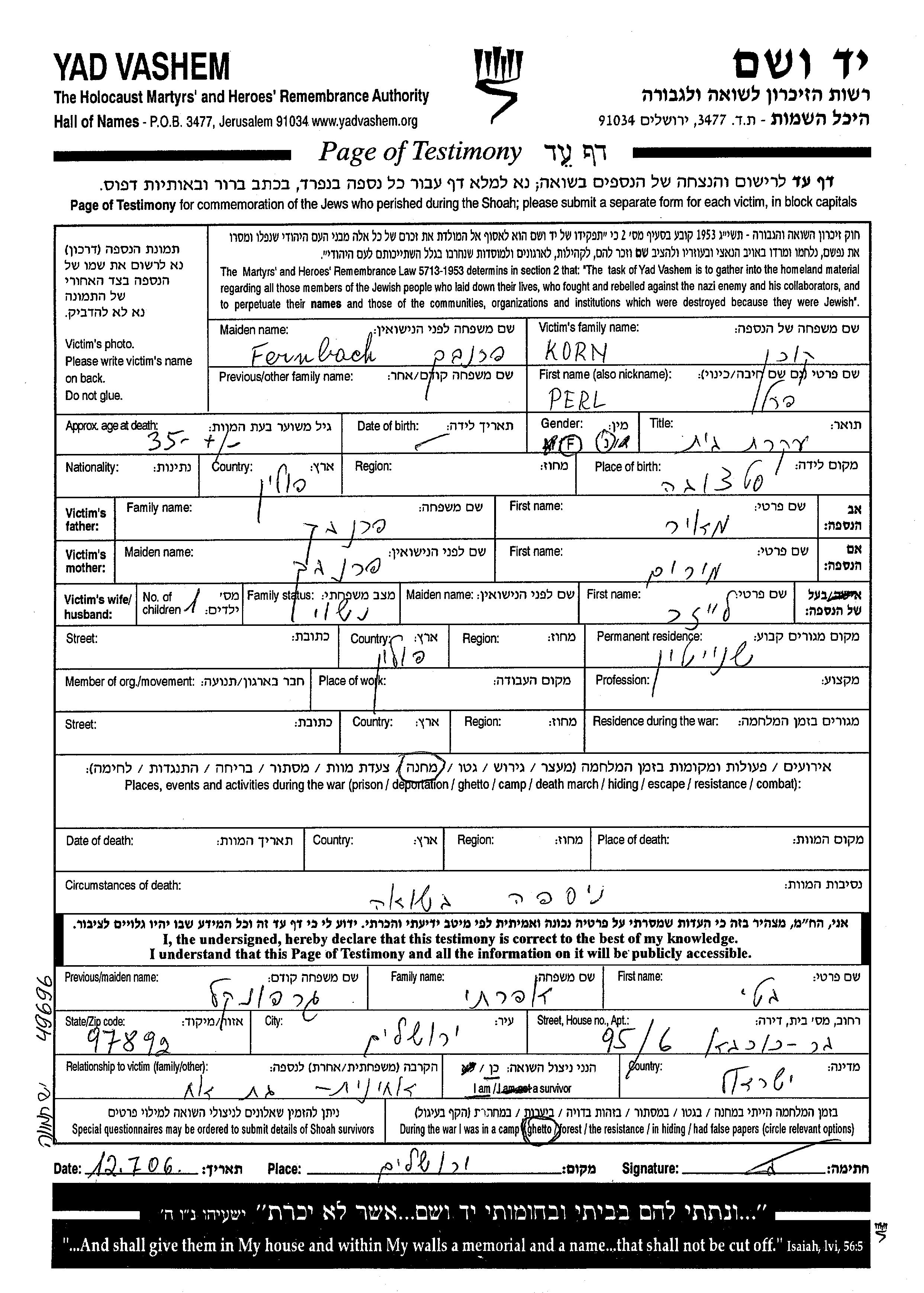 Perel Korn, geb. Fernbakh wurde in Stecowa, Polen geboren. Vor dem Zweiten Weltkrieg lebte sie in Sniatyn, Polen.