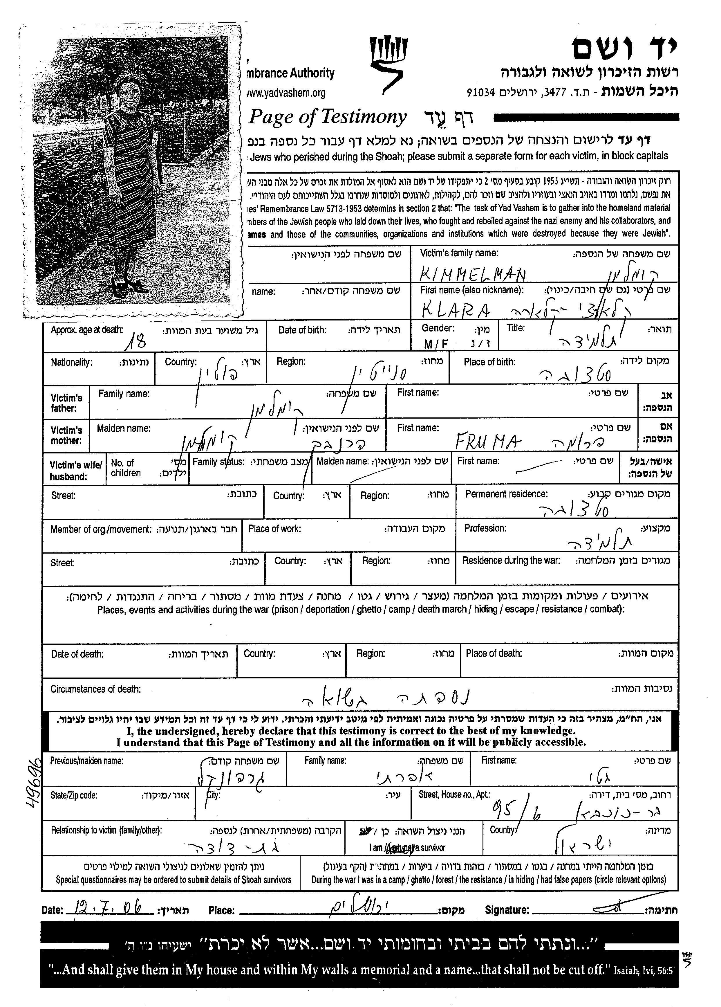 Klara Kimmelman wurde in Stecowa, Polen geboren. Sie war Schüler/-in. Vor dem Zweiten Weltkrieg lebte sie in Stecowa, Polen.