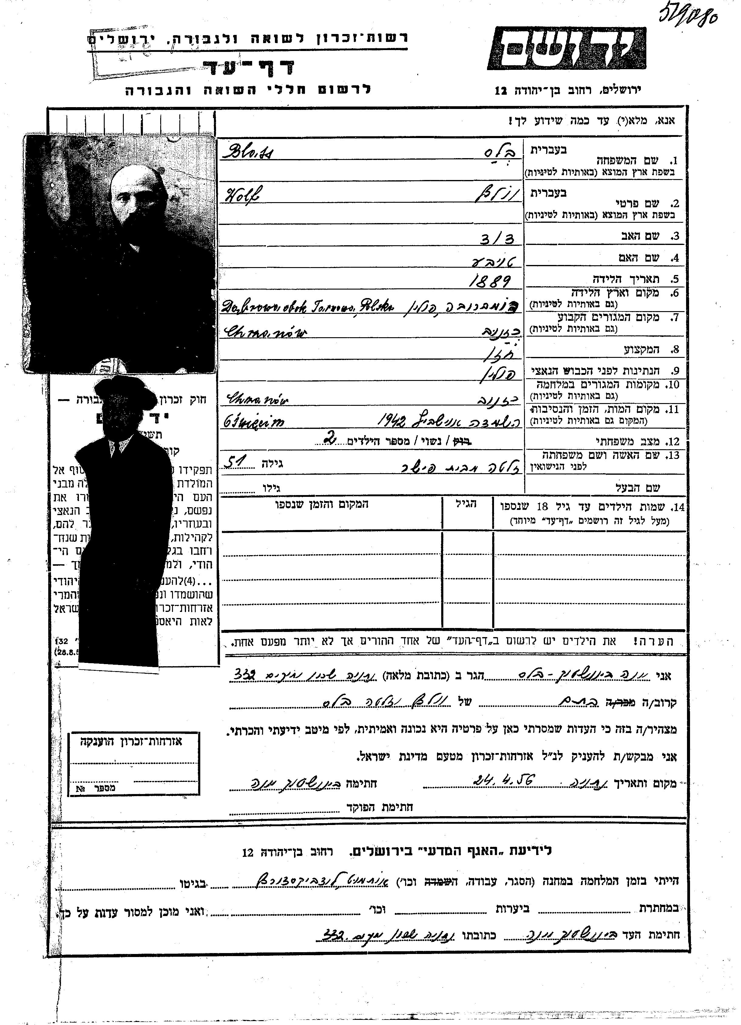 Wolf Blass wurde im Jahr 1889 in Dąbrowa, Polen geboren. Er war Kantor. Vor dem Zweiten Weltkrieg lebte er in Chrzanow, Polen.