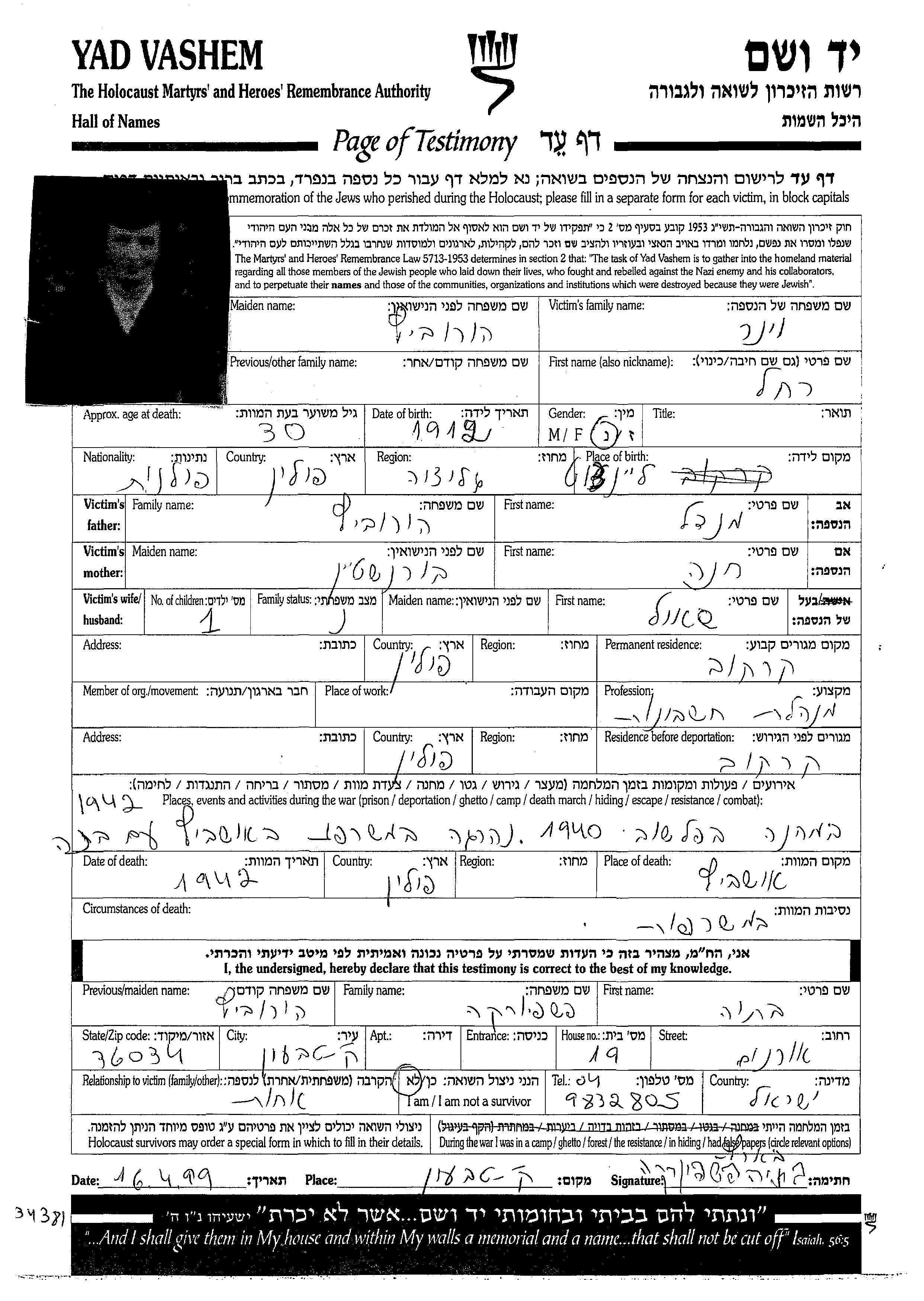 Rakhel Viner, geb. Horovitz wurde im Jahr 1912 in Lancut, Polen geboren. Sie war Buchhalter/-in. Vor dem Zweiten Weltkrieg lebte sie in Krakow, Polen.