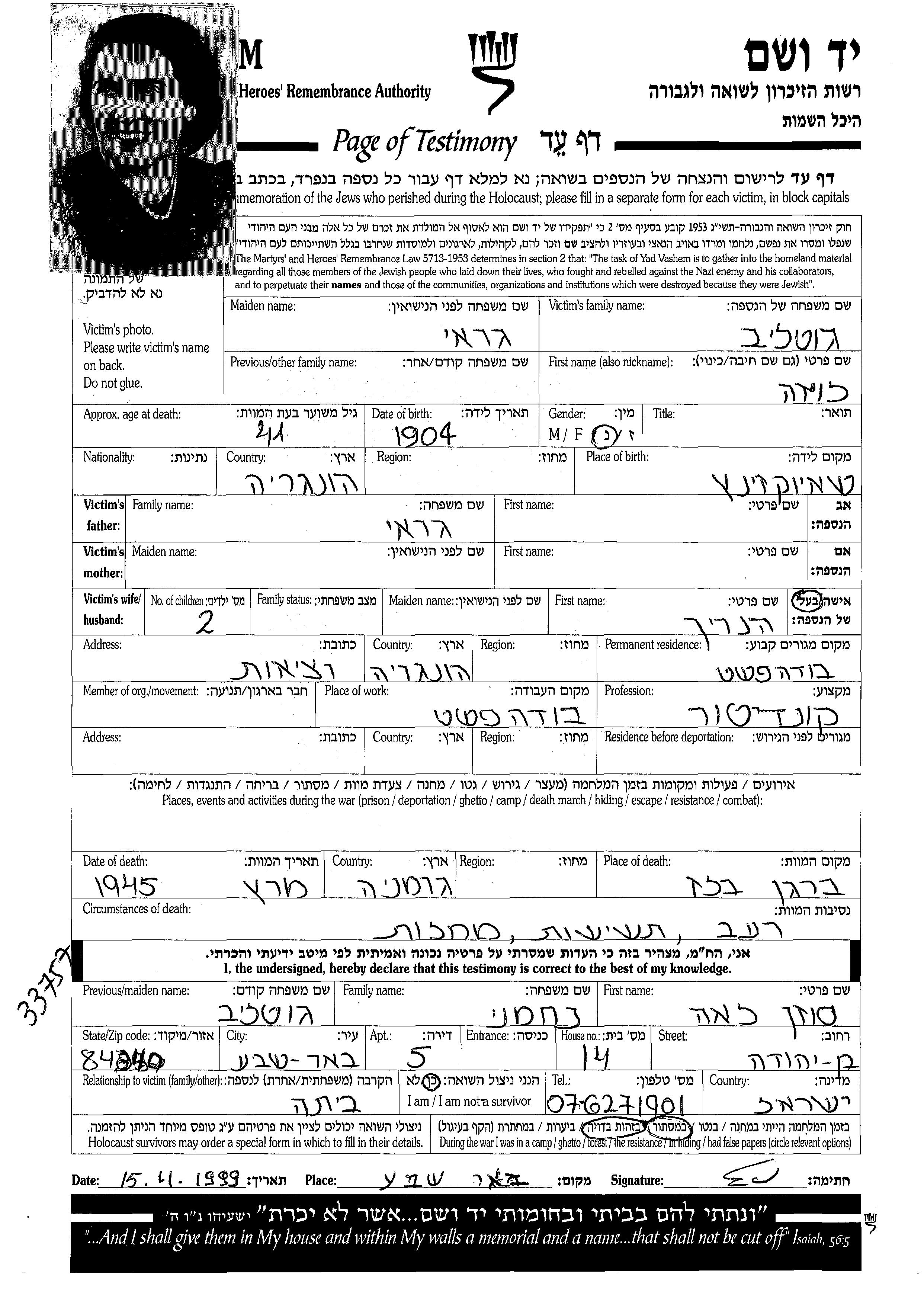 Eliezer wurde in der Schoah ermordet. Todesort: Bergen Belsen, Deutsches Reich im Jahr 03/1945.