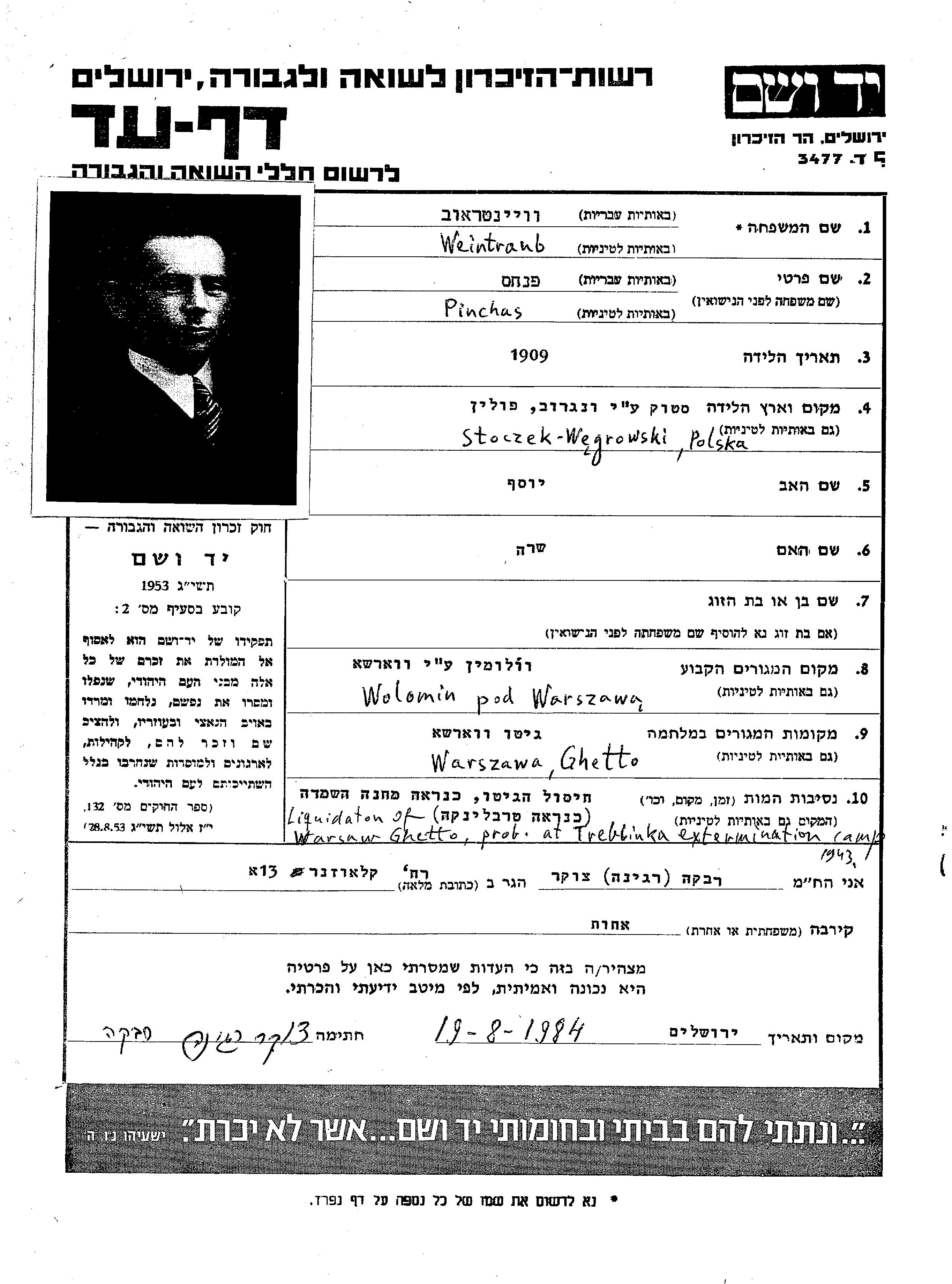 Pinchas Weintraub wurde im Jahr 1909 in Stoczek, Polen geboren. Vor dem Zweiten Weltkrieg lebte er in Wolomin, Polen.