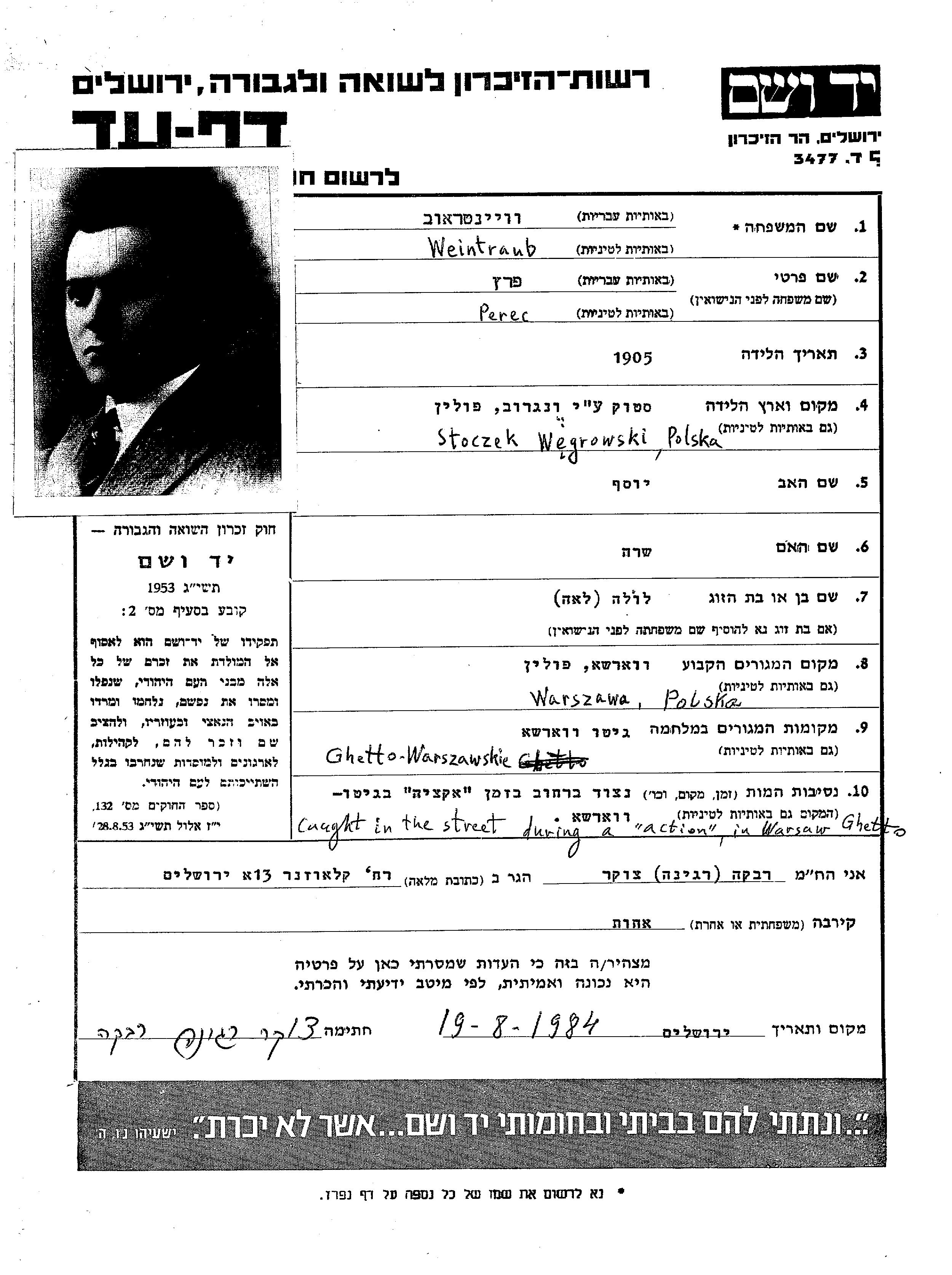 Perec Weintraub wurde im Jahr 1905 in Stoczek, Polen geboren. Vor dem Zweiten Weltkrieg lebte er in Warszawa, Polen.