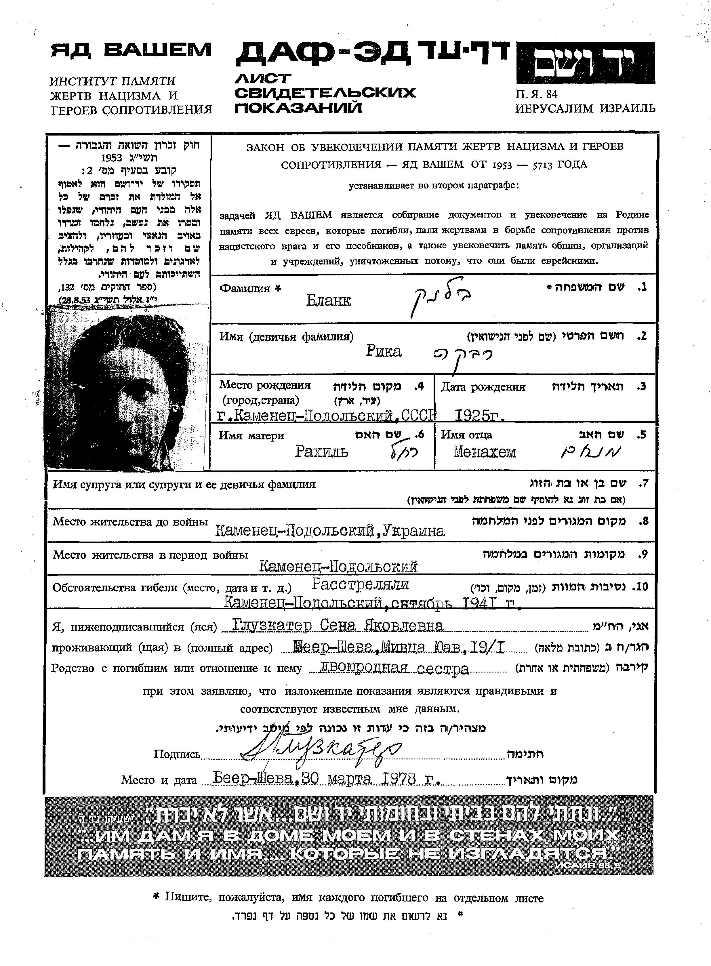 Rika Rivka Blank wurde im Jahr 1925 in Kamenets Podolsk, Ukraine (UdSSR) geboren. Vor dem Zweiten Weltkrieg lebte sie in Kamenets Podolsk, Ukraine (UdSSR).