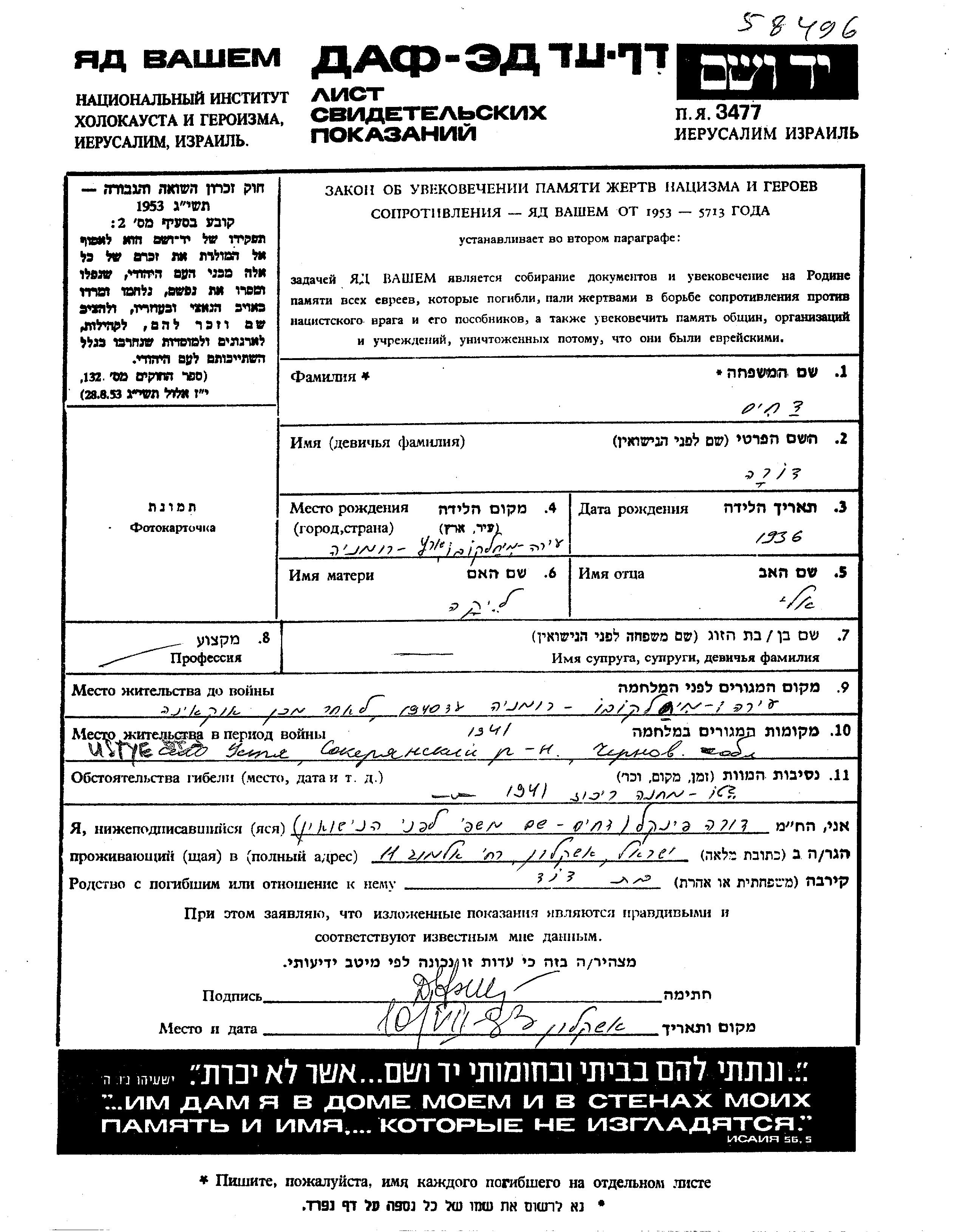 Dora wurde in der Schoah ermordet. Todesort: Ustia, Rumänien im Jahr 1941.