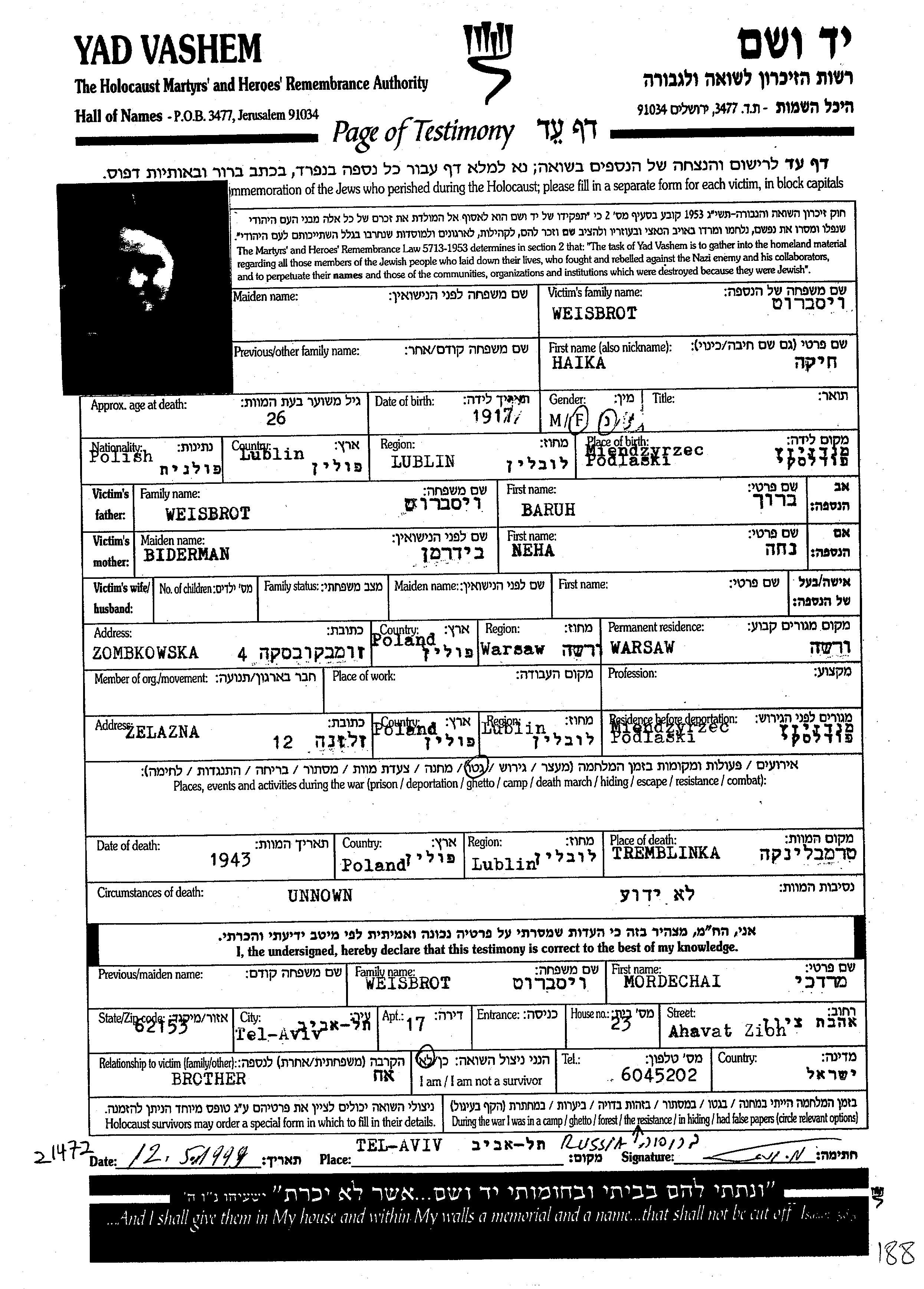 Khaika Veisbrot wurde im Jahr 1917 in Miedzyrzec, Polen geboren. Vor dem Zweiten Weltkrieg lebte sie in Warszawa, Polen.